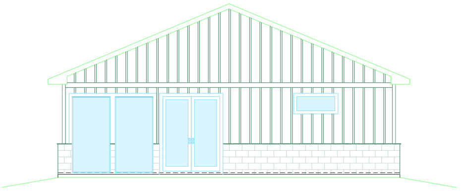 farmhouse modern style dark gray board and batton above rectangular stone wainscotting light metal roof walkway to door pine forest landscaping