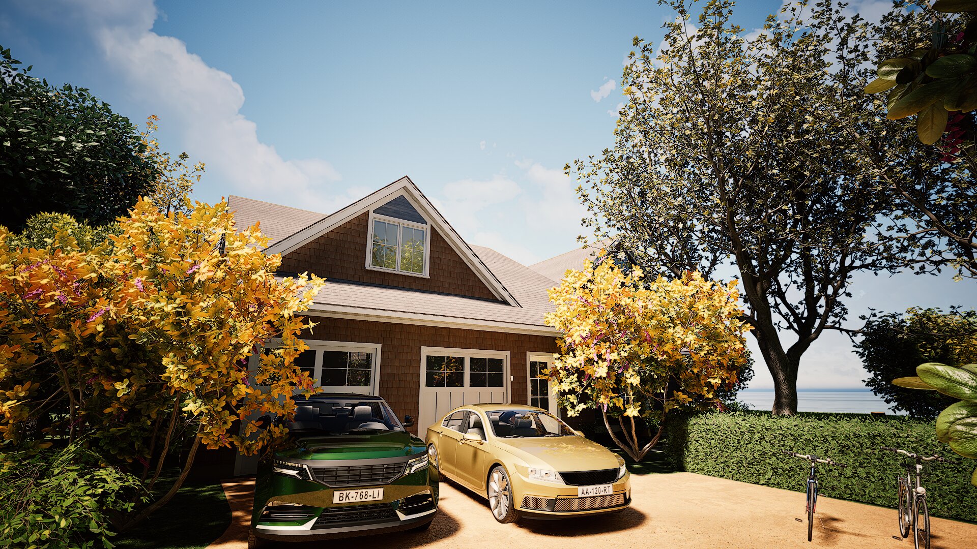 sunrise lighting cinematic shot puffy clouds lush plantings crape myrtle small haze