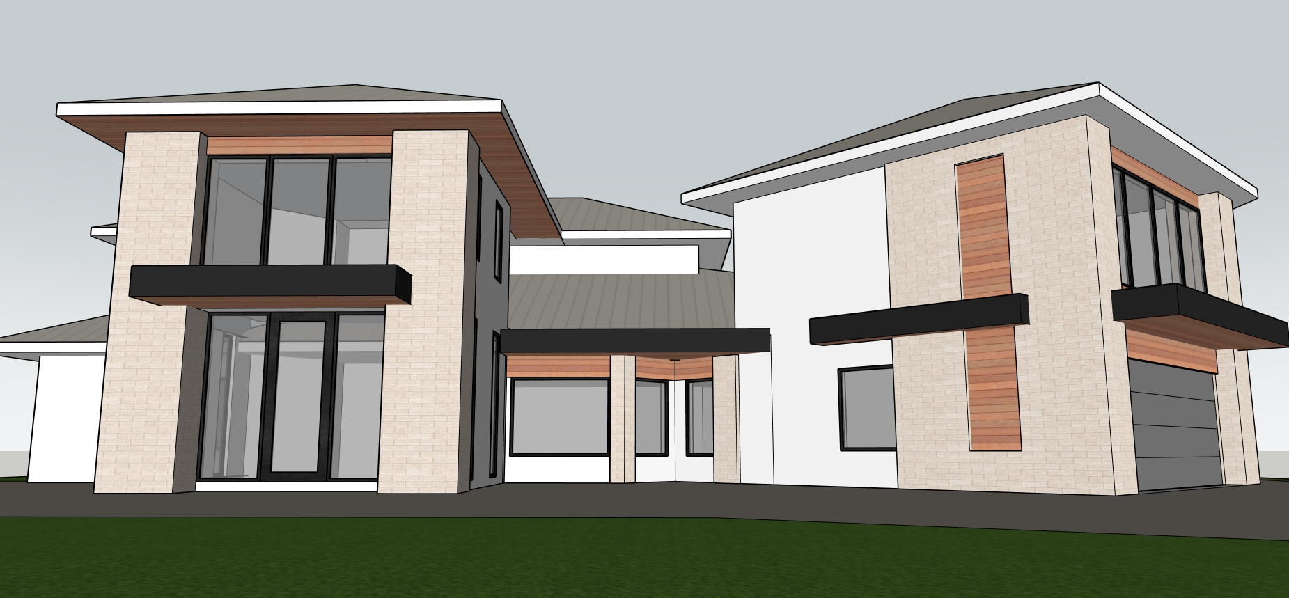 render a modern two story house with a sleek contemporary design the walls are off white with light beige stone accents the window frames and horizontal bands are a deep charcoal black the roof is a smooth light grey metal the wooden paneling under the roof line and above windows is a warm rich cedar brown the driveway is brick complementing the lush vibrant green lawn florida landscape set the scene in a serene early morning atmosphere with a soft overcast sky that casts gentle diffused lighting over the house