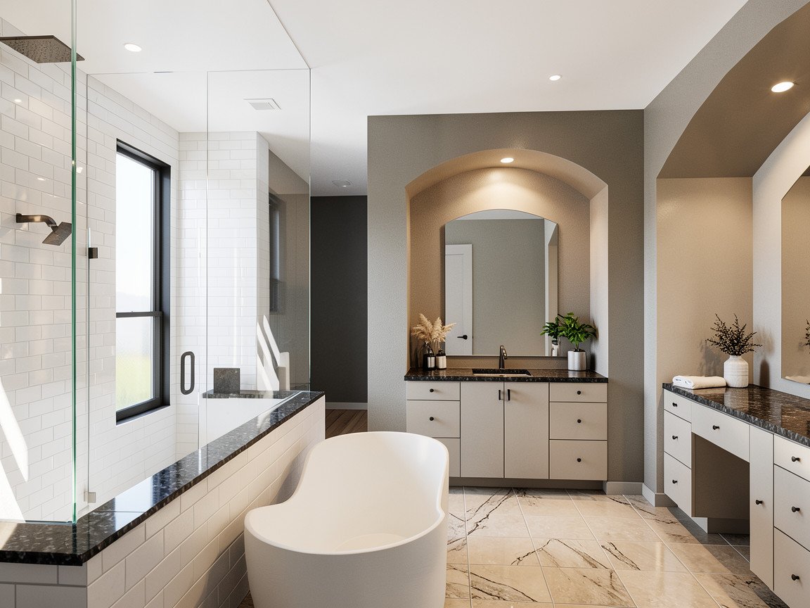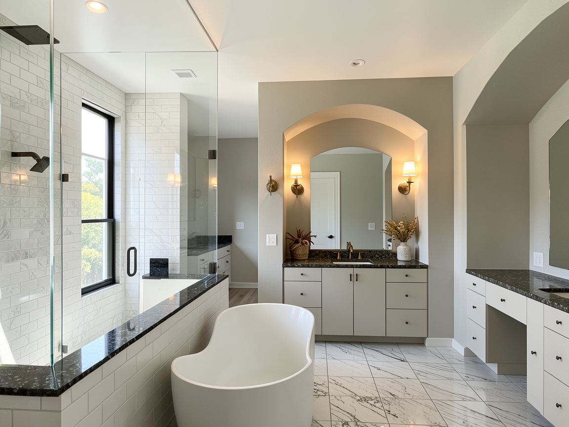use the photo https www flooranddecor com galleries room bathroom gallery 32 to change the finishes in this room add sconces to either side of the mirrors