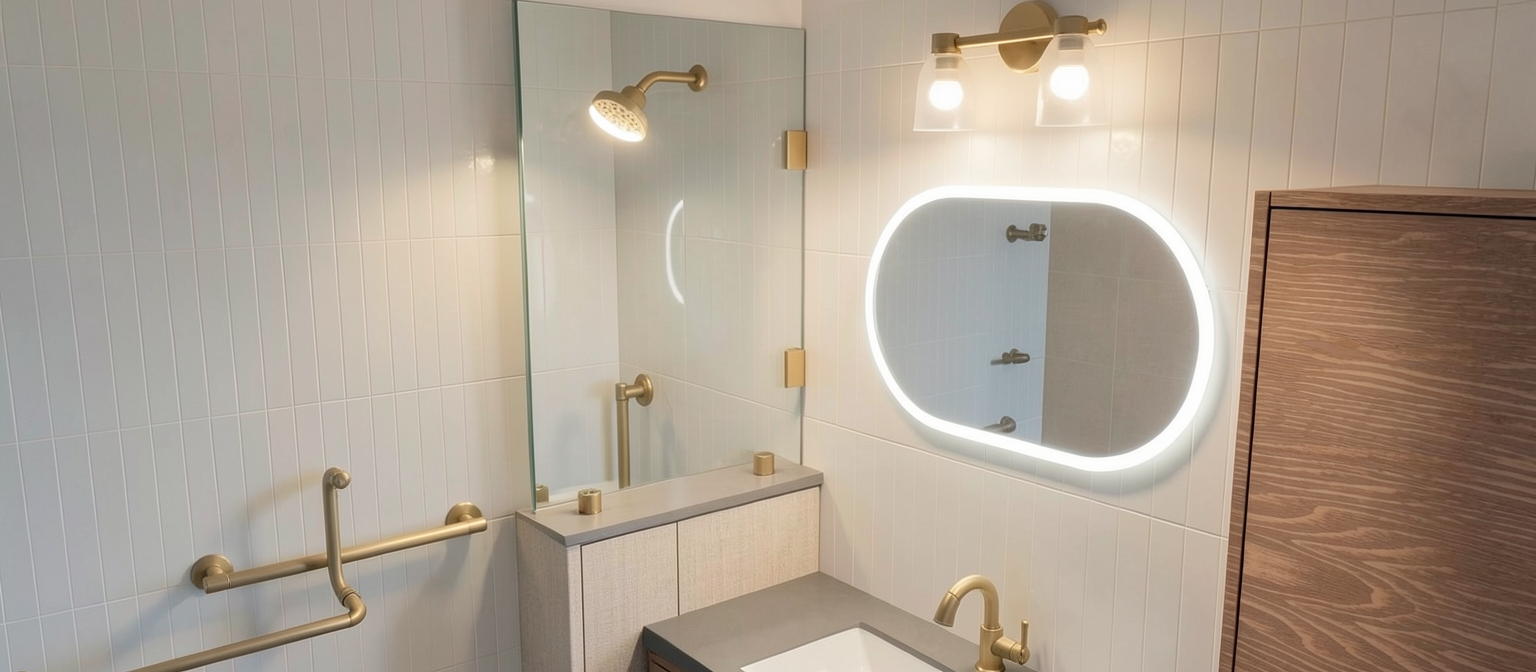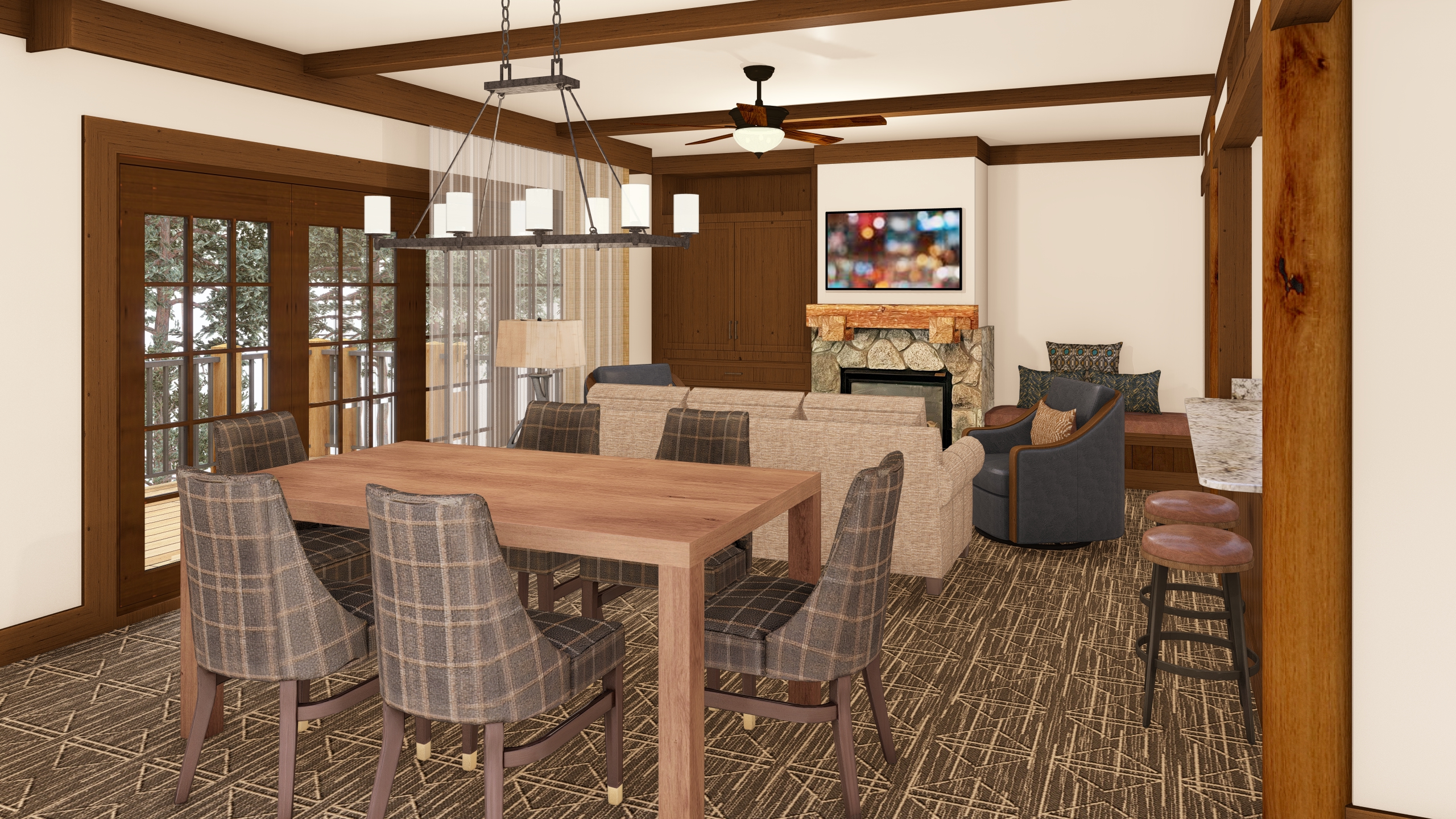 create a warm and inviting living and dining room with a cozy rustic atmosphere the walls should be a soft cream color with rich wooden accents the ceiling features dark wooden beams and a stylish ceiling fan in polished wood and black furnish the space with a comfortable beige sofa complemented by two sleek dark gray armchairs the dining area includes a wooden table with matching chairs in a plaid pattern of muted browns illuminated by a chandelier with white cube lights the room exudes warmth the kitchen in the background has medium brown cabinetry with a marble countertop large windows to the right allow for ample natural light to enhance the space s warmth and elegance