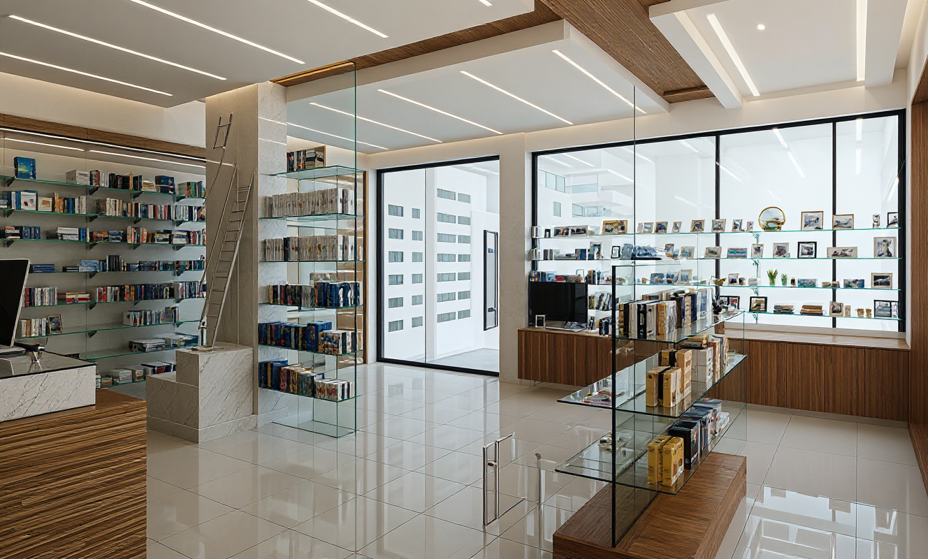 its a living room with vaulted ceiling add lighting fixtures ceiling fan and curtains to the windows the dining table is dark wood with a crystal top and has a flower pot on the center of the table