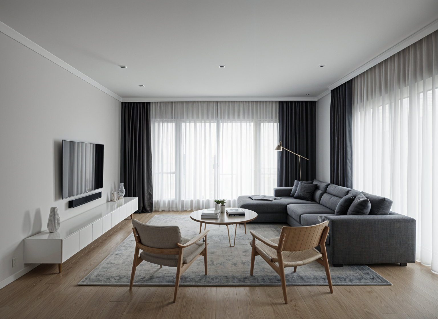 keep only walls and windows remove pipes and railing keep the existing windows stage it as a modern flat with timber floor and hidden lights on the ceiling