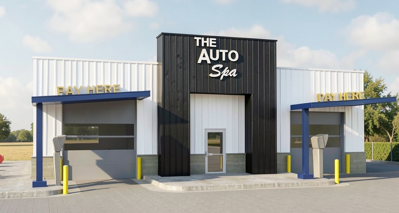 white vertical nuform panels board batten painted black no knots in wood blue canopy detached from building remove shine no metal siding maintain original colors