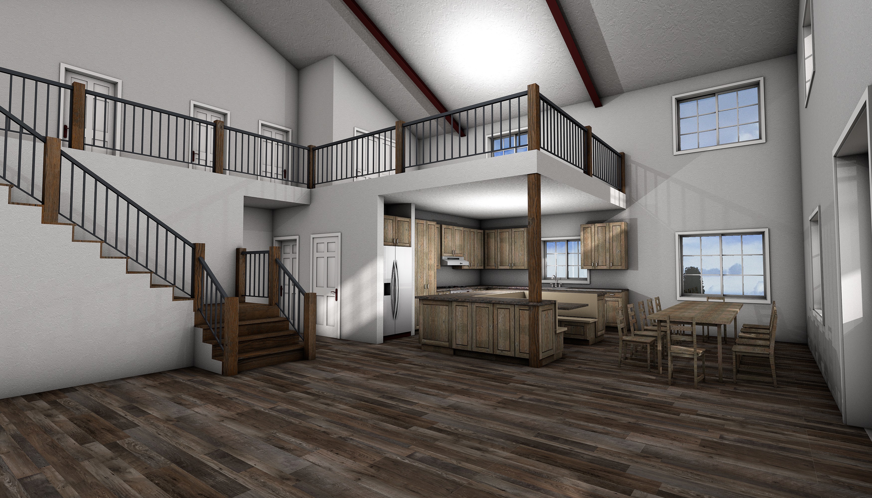 add rustic trim and lighting to this interior image render in hyper realistic photo image be consistent with trim keep ceiling beams as red iron beams maintain cabinet configuration as shown