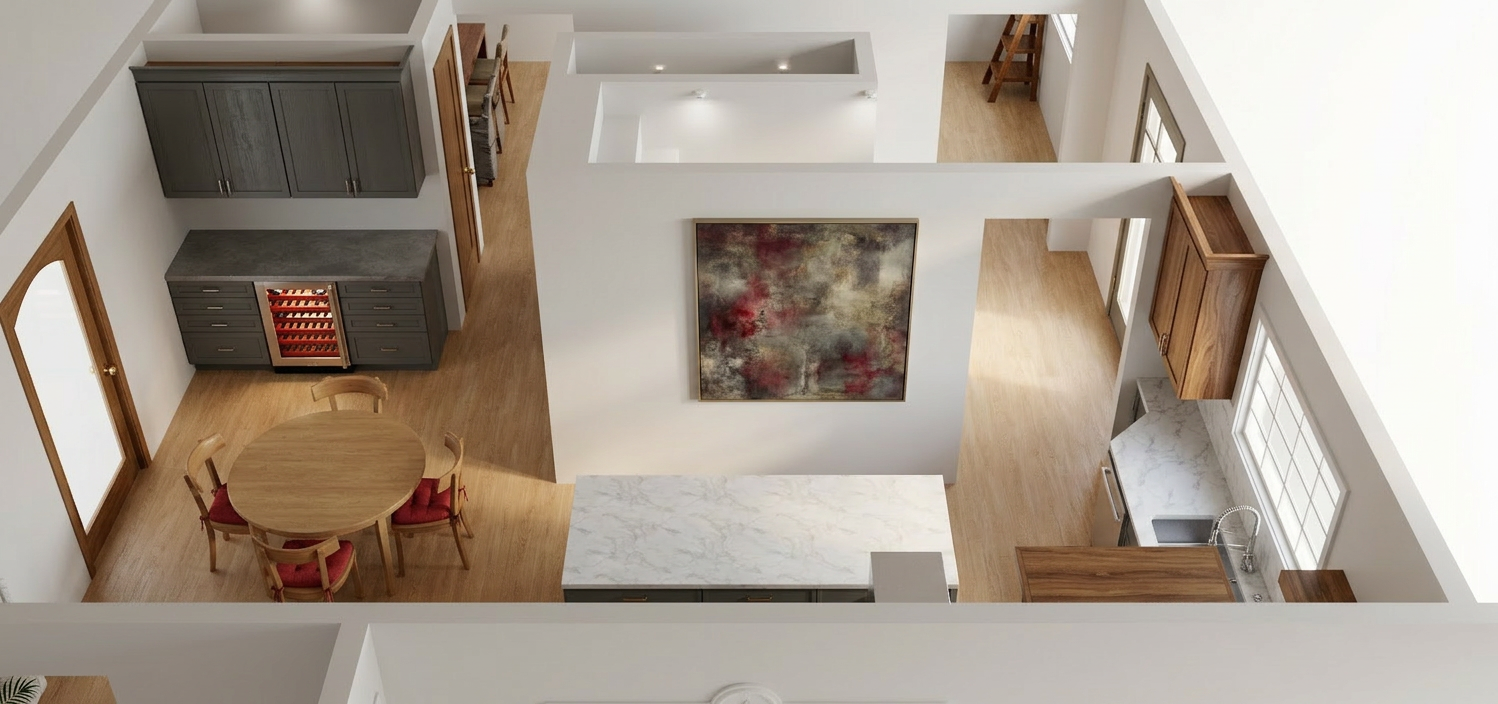 enhance this image without changing the architecture add lighting and image projection under the wood trellis structure and add planting above