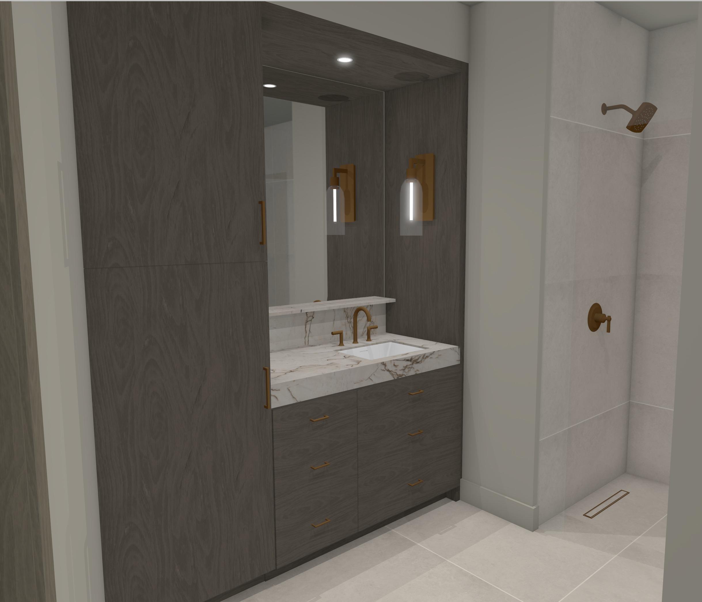 photorealistic rendering interior lights on large format tiles on the floor and walls in the shower