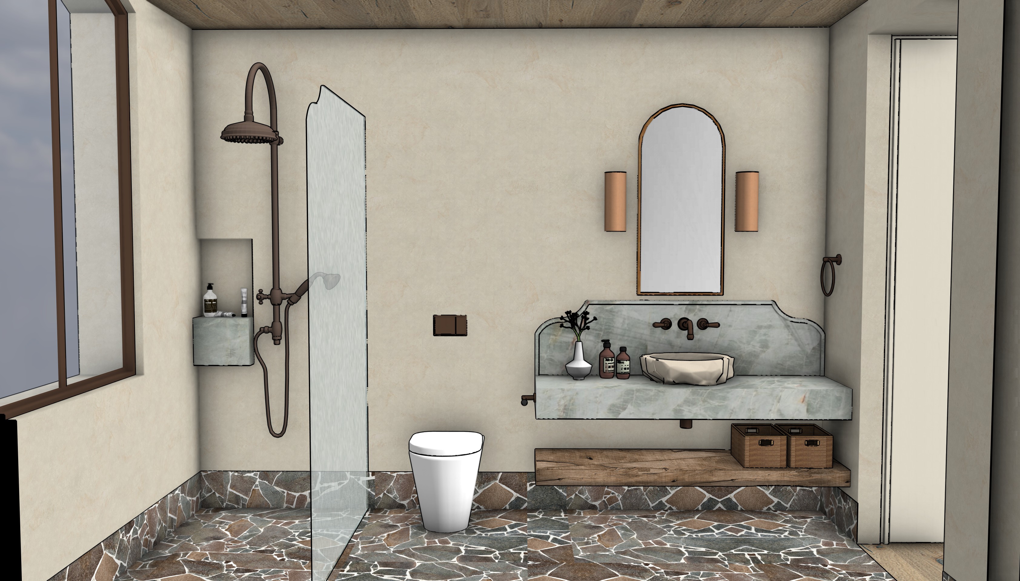 the frame of the mirror is rope the shower screen is flemished glass the basin is a split face onyx the wall sconces are handmade terracotta with small circular sporadic hole cut outs