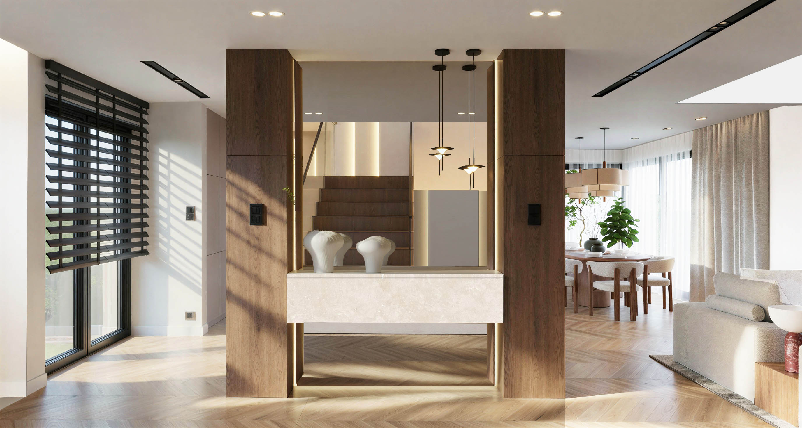 add a few branches to the two white vases on the console not too many just a subtle amount