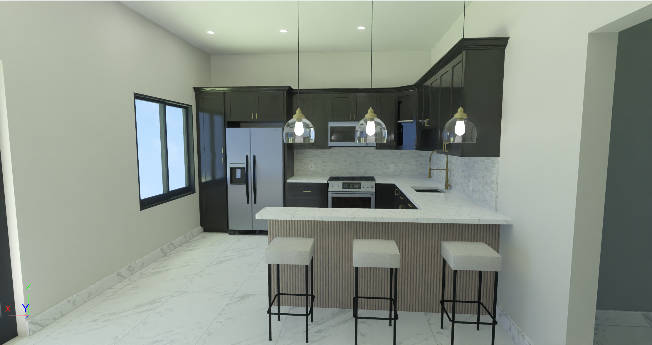 photorealistic interior rendering of a modern l shaped kitchen with peninsula island eye level camera angle 24mm wide angle lens natural daylight entering through a large black framed window on the left wall walls painted in sherwin williams alabaster sw 7008 warm creamy white tone dark charcoal high gloss kitchen cabinets with raised panel doors and decorative crown molding on top white calacatta marble countertops with subtle grey veining kitchen peninsula island with vertical fluted ribbed wood panel front in light oak finish and white marble waterfall countertop seating for three modern square upholstered bar stools with black metal legs three smoked glass pendant lights with brass fittings hanging above the island calacatta marble brick relief backsplash tile with golden veining glossy finish stainless steel french door refrigerator stainless steel range over the range microwave brushed gold kitchen faucet white porcelain tile floor 60x120cm with subtle grey marble veining and thin visible grout lines dropped ceiling with recessed led spotlights warm natural volumetric lighting soft ambient occlusion photorealistic material textures architectural interior photography 8k resolution ray traced global illumination