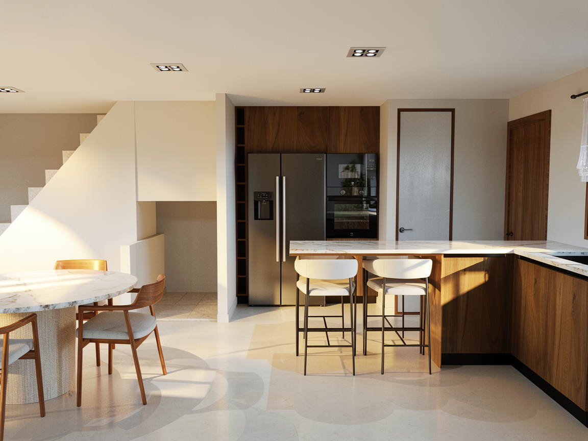 use the provided enscape render as base reference keep exact layout proportions and camera angle enhance natural lighting and refine materials add elderly man and woman drinking coffee at table ensure anatomically correct human proportions add potted plant in corner and large framed picture on the wall in the left side of the room add a coffee machine in the kitchen and a few kitchen accesories
