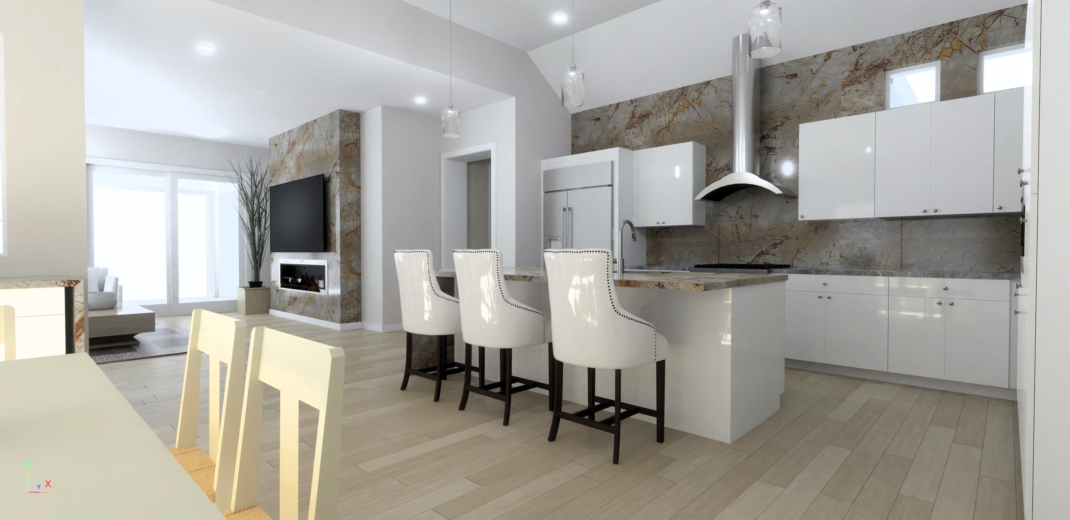 contemporary interior shot render a modern open concept kitchen and living area with a bright and airy atmosphere use black cabinets with white quartzite countertops flooring should be 36 x 36 white tile feature a large white kitchen island with a smooth glossy marble countertop in beige and gray swirls the elegant chairs at the island should be upholstered in ivory fabric with dark wooden legs and subtle silver nailhead trim the floor should have light beige wooden planks include sleek white cabinetry and a stainless steel range hood for a contemporary touch the living area should have a large wall mounted tv on a backdrop of brown and gray marbled tiles complemented by a light gray sofa and a natural beige area rug large windows should flood the space with natural light creating a calm and inviting atmosphere architecture