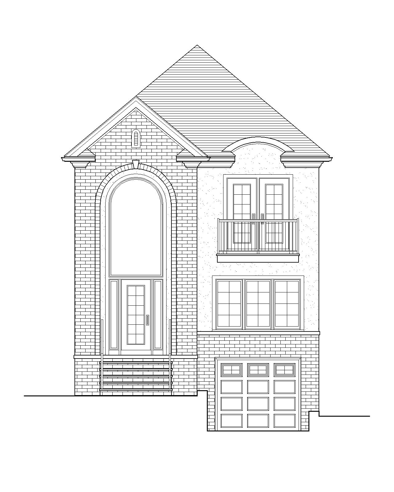 render this elevation realistic in a setting with some landscaping in a residential neighborhood the windows and doors should be black the brick should be a natural color and stucco should be in a light modern color