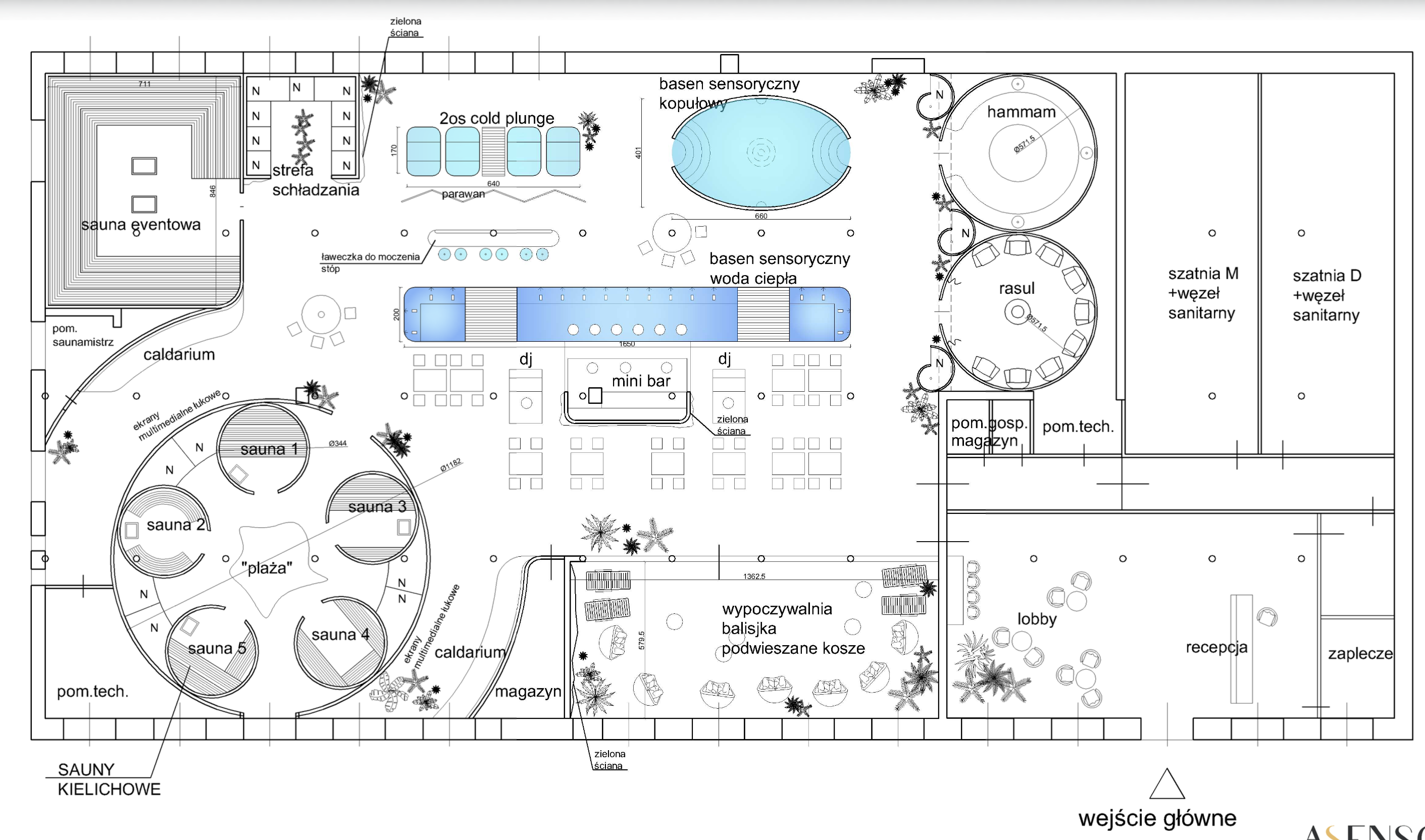 3d architectural model of a wellness social club based on a provided floor plan style industrial balinese loft features high ceiling warehouse with red brick walls and black steel frames centerpiece 5 circular pod style saunas arranged around a wooden deck a long linear sensory pool next to a stone clad mini bar with integrated dj booths a balinese lounge with hanging rattan chairs and dense vertical gardens lighting cinematic warm ambient light with volumetric rays from floor to ceiling industrial windows materials teak wood lava stone weathered brick and polished concrete