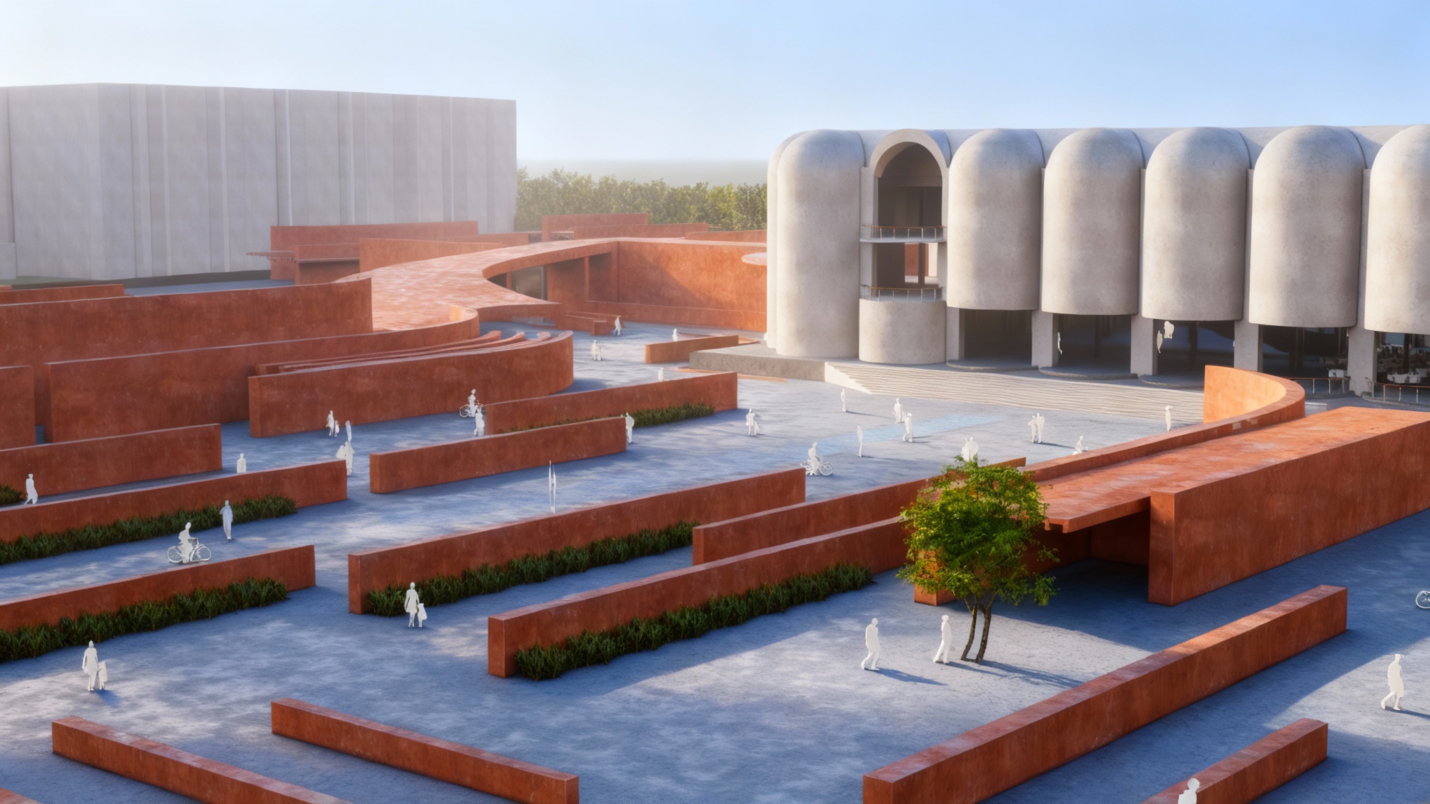 render this image photorealistic keeping all the elements create an ambiance with people light coming form inside the building bohemian vibe