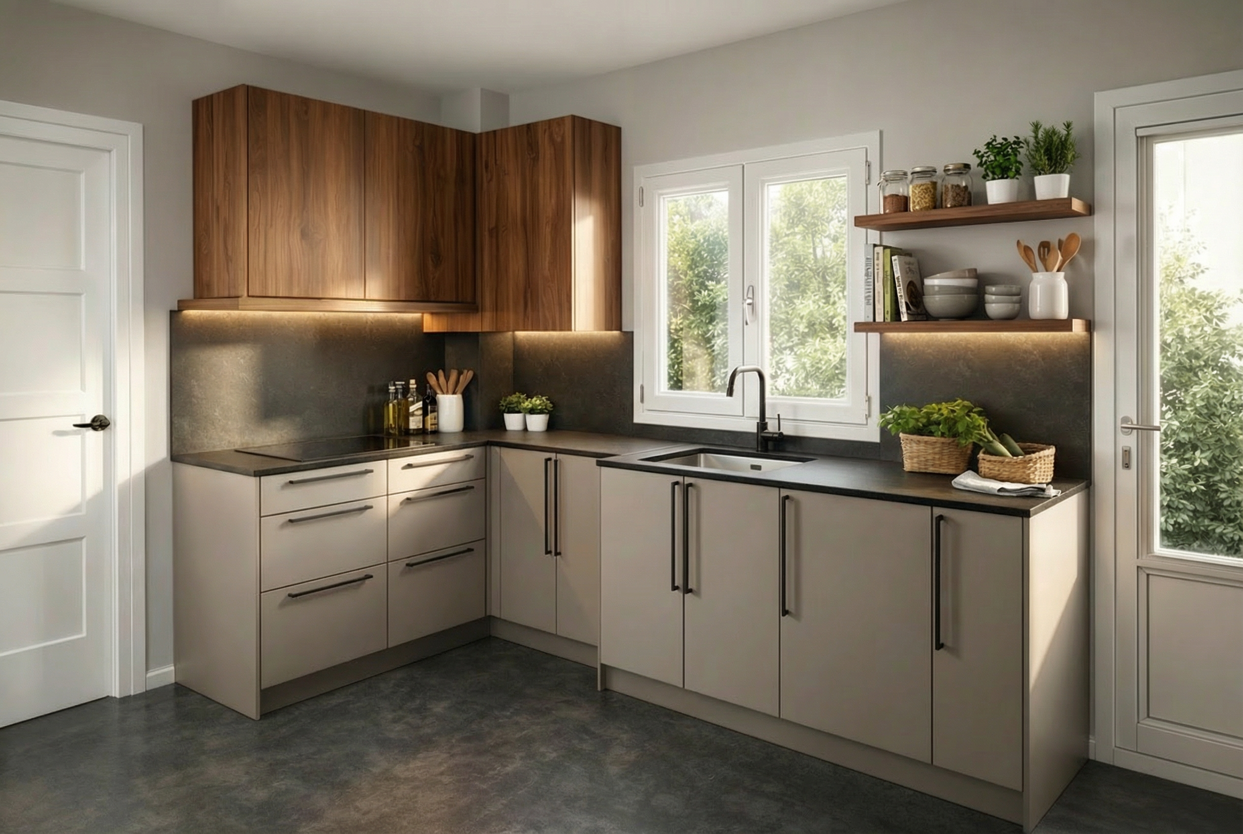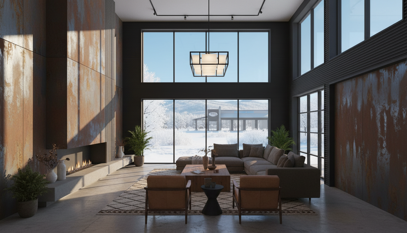 light your interior like a cloudy day transform your interior design photo into a hyper realistic architectural visualization of a contemporary modern interior preserve the exact geometry layout proportions and materials of the original design lighting create an atmosphere of soft overcast daylight reminiscent of a cloudy rainy day without visible rain with diffused natural light streaming through the windows a subtle ambient glow enhances depth and spatial layering maintain balanced contrast avoiding harsh shadows and highlights materials and textures enhance material realism micro details surface imperfections soft reflections precise roughness and physically accurate light response highlight textures wood grain fabric weave stone lamp metal and matte finishes high micro contrast and tangible depth rendering style ultra photorealistic architectural visualization cinematic quality natural color grading neutral tones soft highlights realistic global illumination physically based rendering high dynamic range premium interior photography camera and composition wide angle architectural lens natural perspective eye level view deep focus sharp details throughout the frame natural framing no distortion atmosphere calm elegant contemporary upscale residential atmosphere clean minimalist sophisticated and free of visual noise output 8k resolution ultra detailed noise free sharp edges professional quality architectural rendering negative cons no raindrops glare fog haze motion blur cartoonishness stylization over sharpening artificial glow unrealistic reflections distortion or clutter additional information there is a white radiator under the air conditioning the sofa has no fabric frame on the left side between the curtains there is a white window with a window sill and a curtain above the table there are white rough lamps with a lamb s eye structure do not turn on the lights in the lamps nie ma okna nad kaloryferem