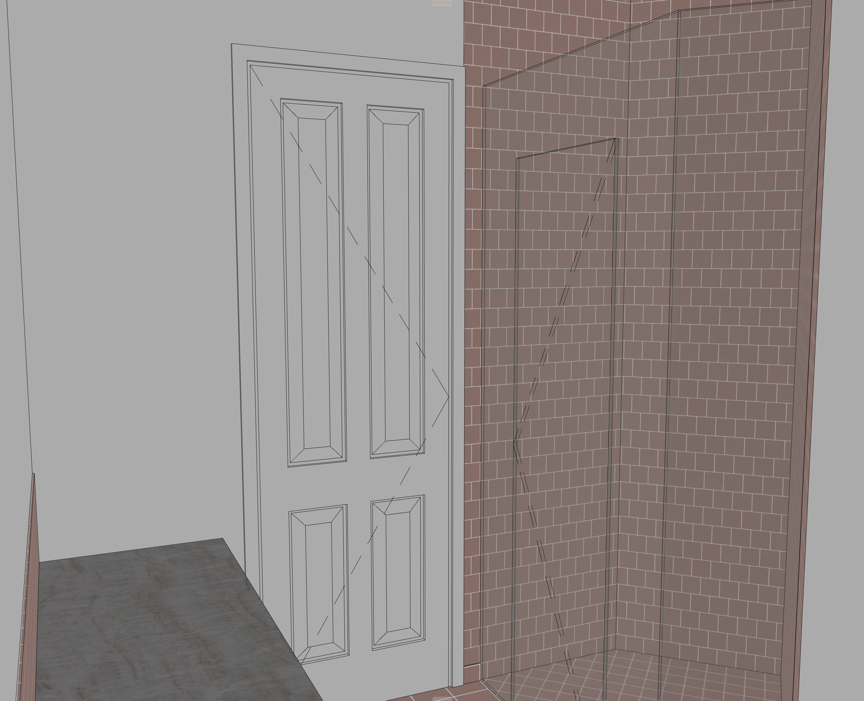enhanced interior lighting shower head and controls on central tile wall behind glass sink on countertop in the bottom left