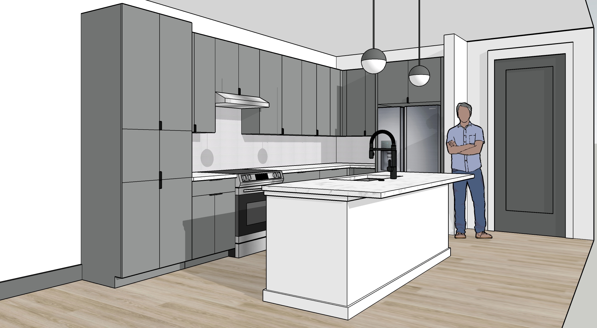 make the grey cabinets a medium wood grain color such as special walnut with white marble countertops make the island a sage green with soapstone countertops change the pendant lights to a transitional farmhouse style keep walls and flooring the same