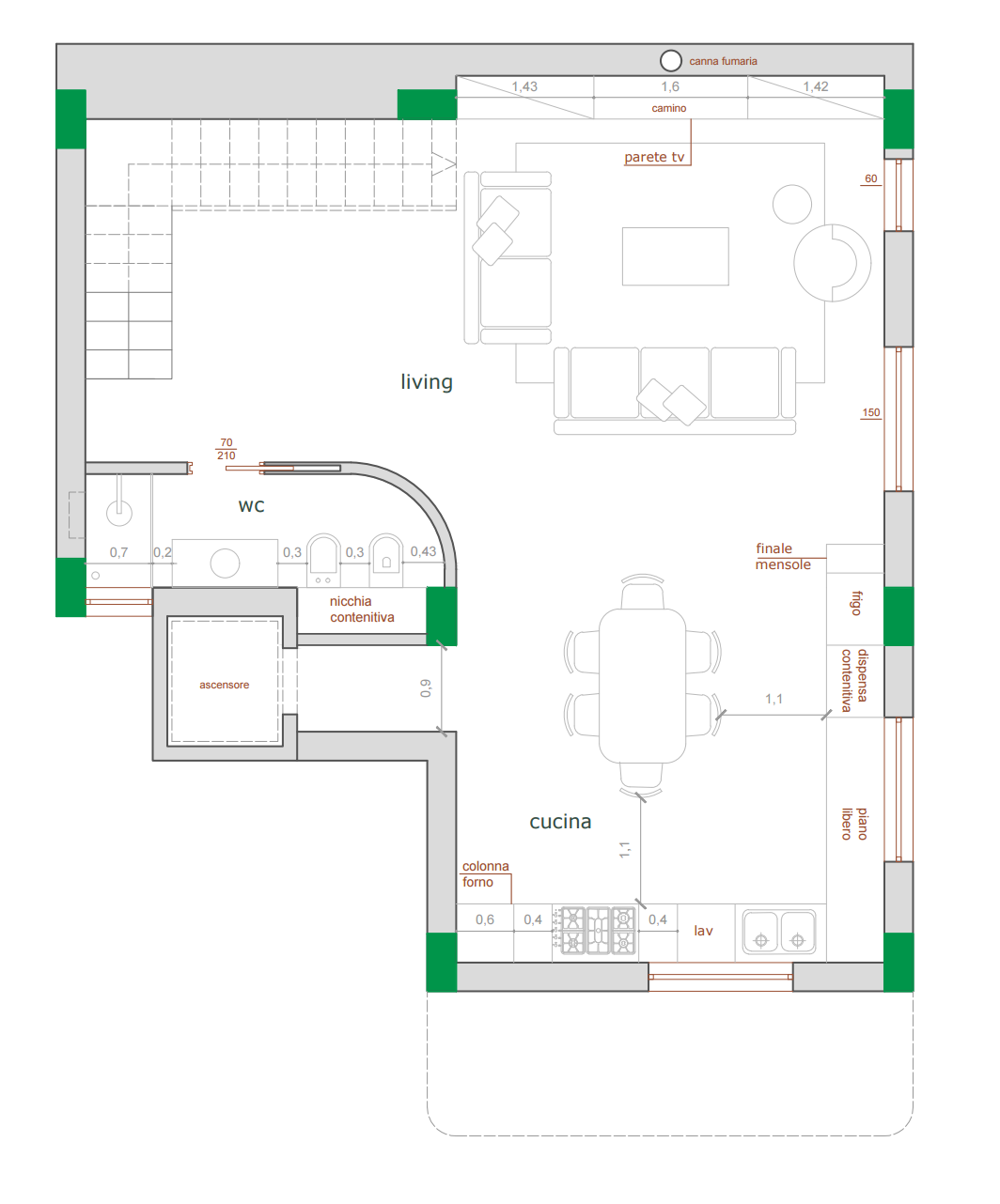 convert this floor plan into a realistic isometric 3d view of a full house show the space from an elevated angle with furniture walls and details visible questa una taverna in stile rustico moderno sotto la scala c un mobile contenitivo il camino deve essere a legna ma con struttura moderna in cartongesso use the same furniture as shows on the plan do not change the orientation of the floorplan