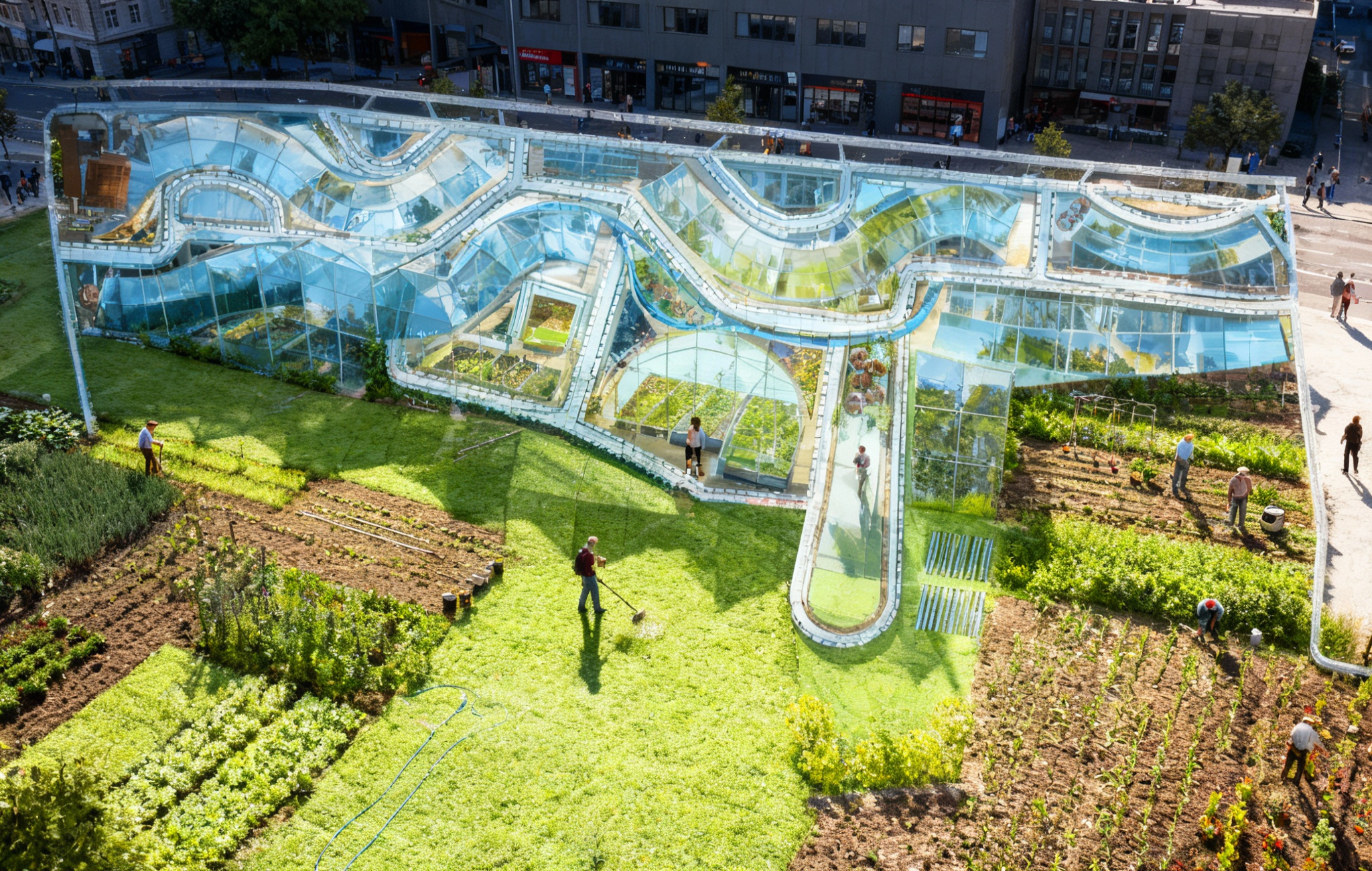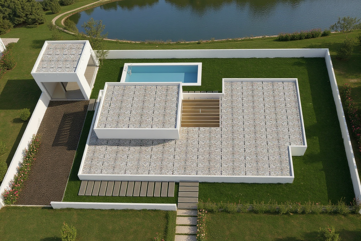 archsynth prompt plan locked no 3d allowed enhance and texture the uploaded image as a strict 2d floorplan this task is plan enhancement not architectural rendering absolute constraints do not violate treat the uploaded image as a flat 2d drawing do not generate any 3d geometry do not create axonometric isometric or perspective views do not add building height fa ades or volumetric shadows do not tilt rotate or reinterpret the plan all work must remain perfectly flat and orthographic think of this as photoshop style plan texturing or competition masterplan graphics not a render visual goal a highly detailed realistic looking 2d masterplan with textures people silhouettes top down trees cars furniture top down symbols soft plan shadows only under trees parasols people no depth no perspective colour coded program instructions apply textures and activity only within existing coloured areas do not change boundaries 1 light blue glass greenhouses flat roof plan graphics with subtle glass texture interior planting beds visible as 2d patterns people shown as top down silhouettes 2 light green farmland 2d crop patterns with varied row densities and colours farming activity shown with plan symbols only 3 dark grey commercial buildings roof plans only sloped roofs represented via texture direction not volume solar panels shown as flat arrays 4 brown stripes 2 storey wooden buildings wood shingle texture strictly following stripe direction solar panels flat no fa ades 5 red parasols covered playgrounds circular parasols in plan playground equipment shown in plan symbols children as small top down figures 6 pink parasols public hangout spaces plan view parasols tables benches people sitting 7 purple picnic areas purple grass texture bbq squares flat picnic blankets and groups in plan 8 yellow commercial stalls flat wooden stall roofs market density shown through plan symbols and people 9 blue elevated pedestrian boulevard represent elevation symbolically only lighter shadow underneath high line style furniture and planting shown from above only no railings or side views 10 open air amphitheatre plan geometry only stepped seating represented by concentric rings or linework 11 parrot green green public areas grass textures shrubs walking paths people 12 beige public walkways large format stone paving texture in light terracotta 13 orange existing buildings flat roof plan symbols with wooden shingle texture 14 light grey double way roads flat asphalt texture cars shown strictly top down 15 white parallel parking cars placed in 70 of slots all in plan 16 teal amphitheatre active use people seated as dots or silhouettes band shown as plan symbols 17 darkest green lines trees tree canopies as flat circles with varied opacity native seven sisters species implied through canopy shape style keywords important use these exact terms 2d masterplan graphic flat orthographic plan gis style realism competition board quality no 3d interpretation graphic realism override very important while remaining strictly flat and orthographic the visual quality must match high end international architecture competition boards apply photorealistic surface treatment using high resolution aerial photography style textures subtle colour variation dirt wear and irregularity natural material grain wood stone soil asphalt no flat vector fills people cars trees furniture must appear as top down photographic cut outs not icons or illustrations correct real world scale soft contact shadows directly beneath objects slight variation in tone and size to avoid repetition shadow lighting rules shadows must be soft short and directly underneath objects no long shadows no directional drama shadows should enhance depth without implying height use ambient daylight only