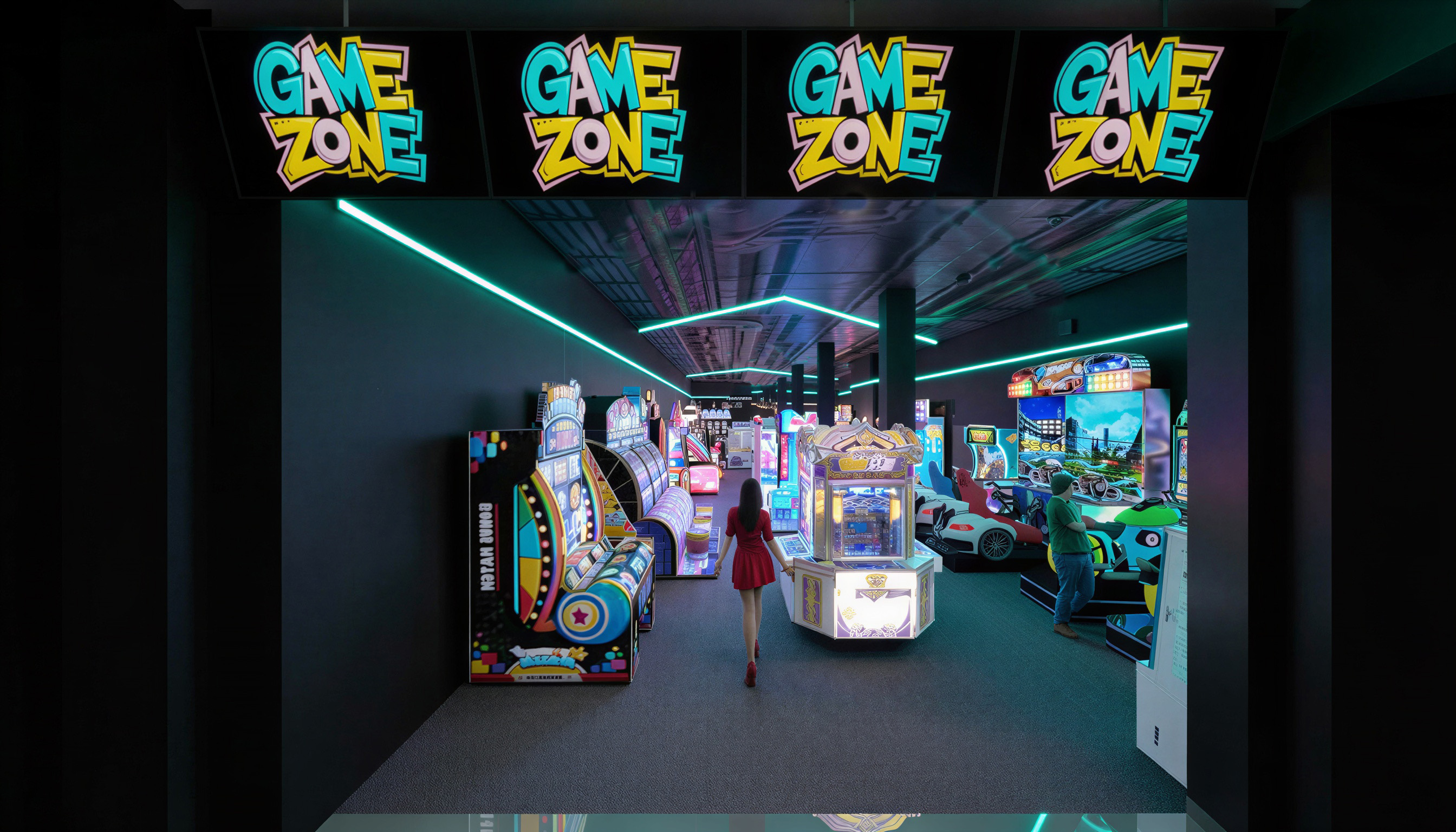 an arcade and gaming hall the machines glow brightly black walls and a black ceiling the floor covered in dark gray carpet turquoise light lines on the ceiling and turquoise lighting under the furniture create a photorealistic effect