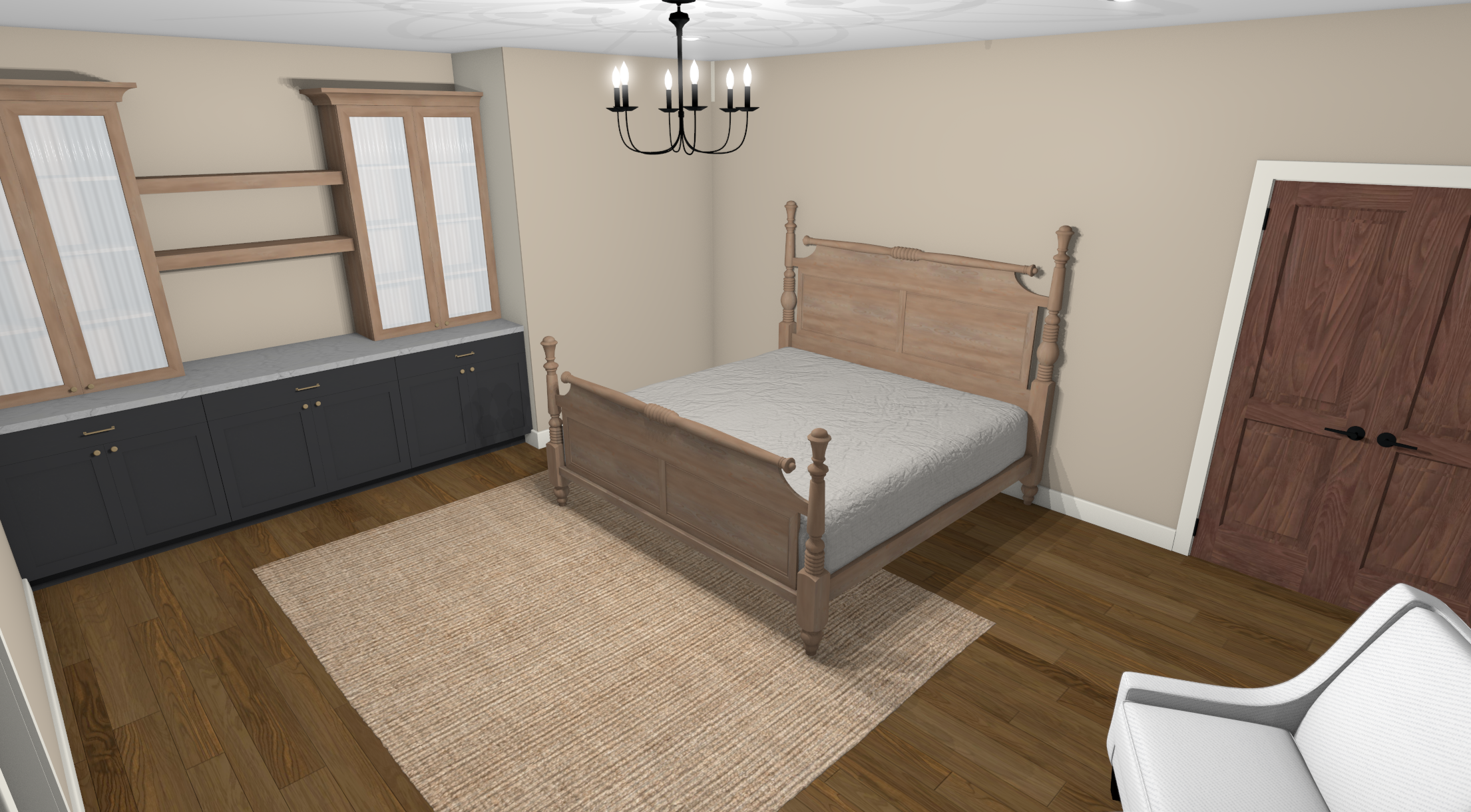 add transitional decor and furniture soft shadows golden hour lighting summer calm colors cozy coffee bar on the cabinetry