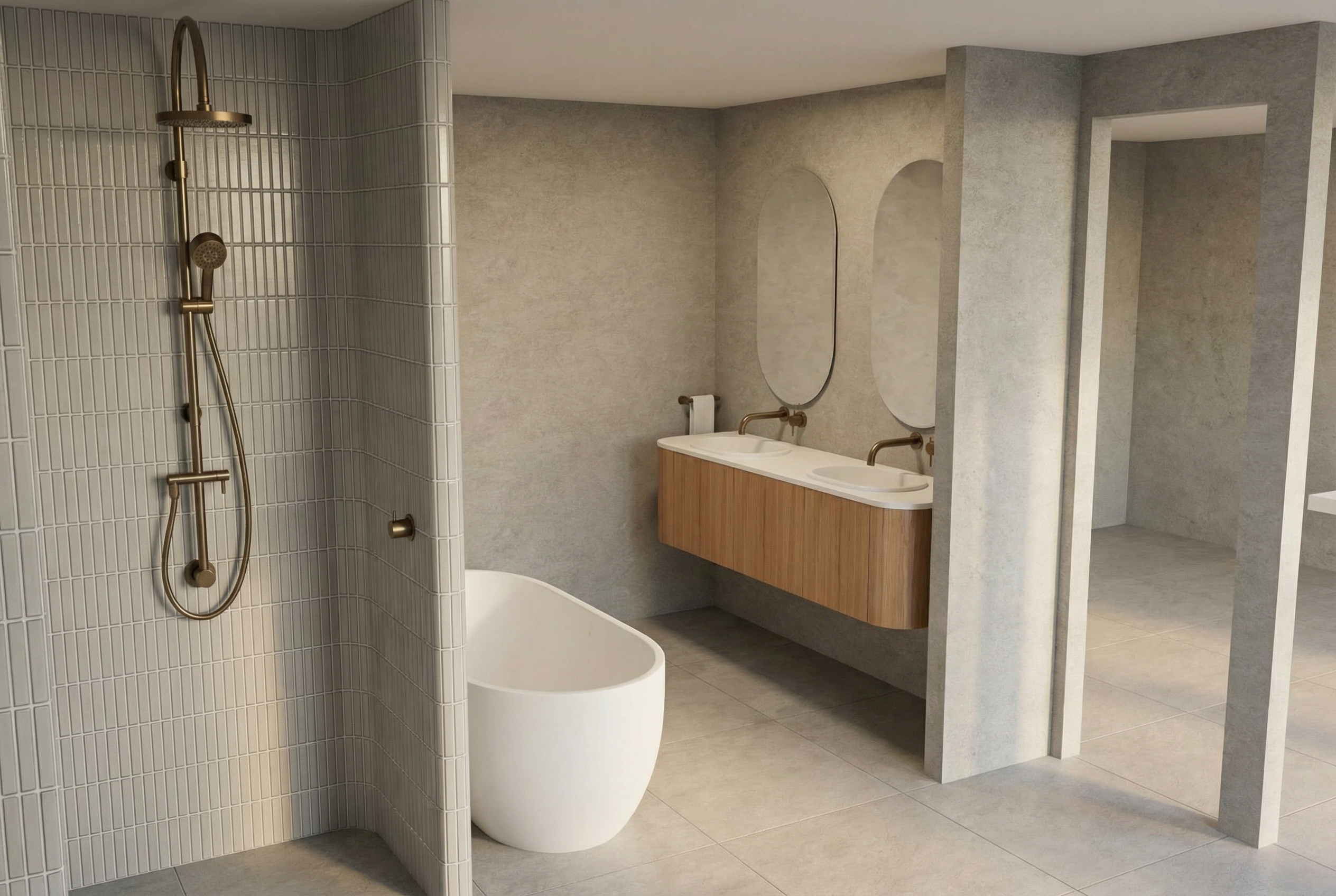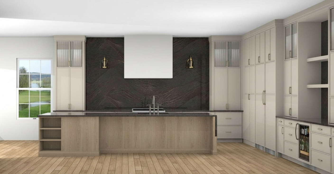 the part of the cabinet with a glass front also has a glass countertop make sure they are glass the other countertops are white marble with grey veins mainain colors there is no waterfall element to the marble countertops it is green cabinet to match on the sides of the long cabinet use the green color as shown in my original concept drawing make the cabinets an grey green duskier match the color of dunn edwards bijoux green de6266 but more grey and duskier even more grey like army green make the color lighter and less vibrant and add more grey to the green make the cabinets more grey less green make the floating shelves light walnut