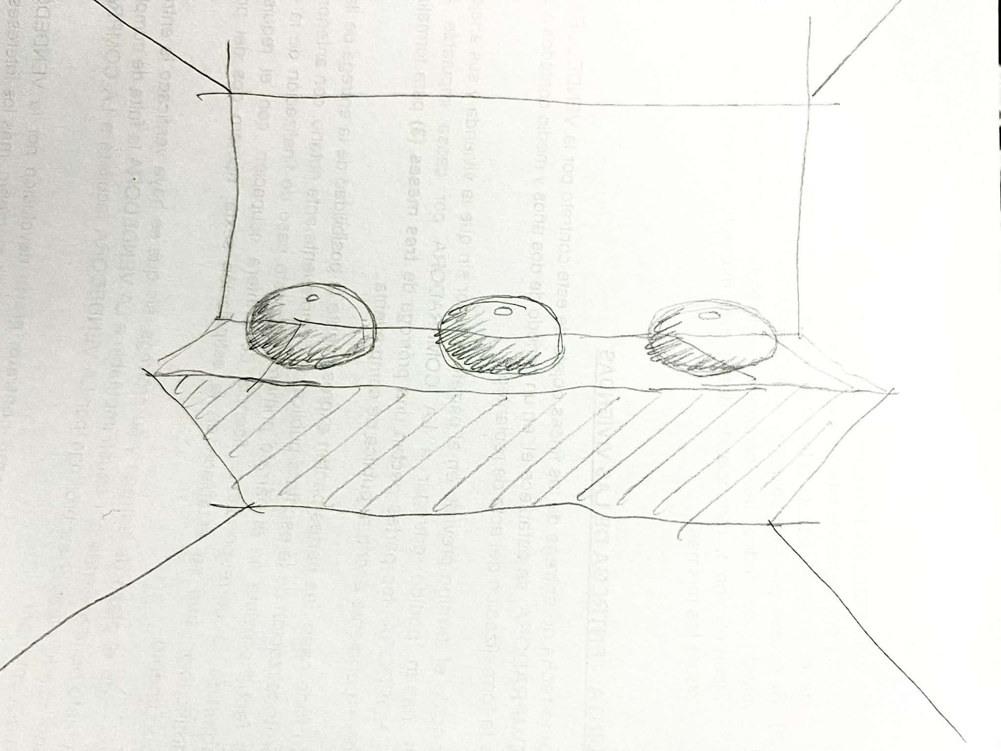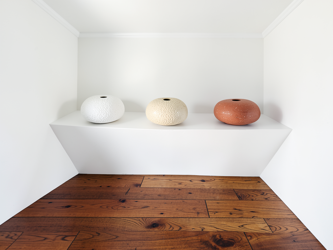 conjunto de tres esf ricas cer micas con textura rugosa y un peque o agujero circular en la parte superior son de colores blanco crema y terracota est n situadas sobre una peana con un plano inclinado de color blanco las paredes y el techo son blancos y el suelo es de tarima de roble