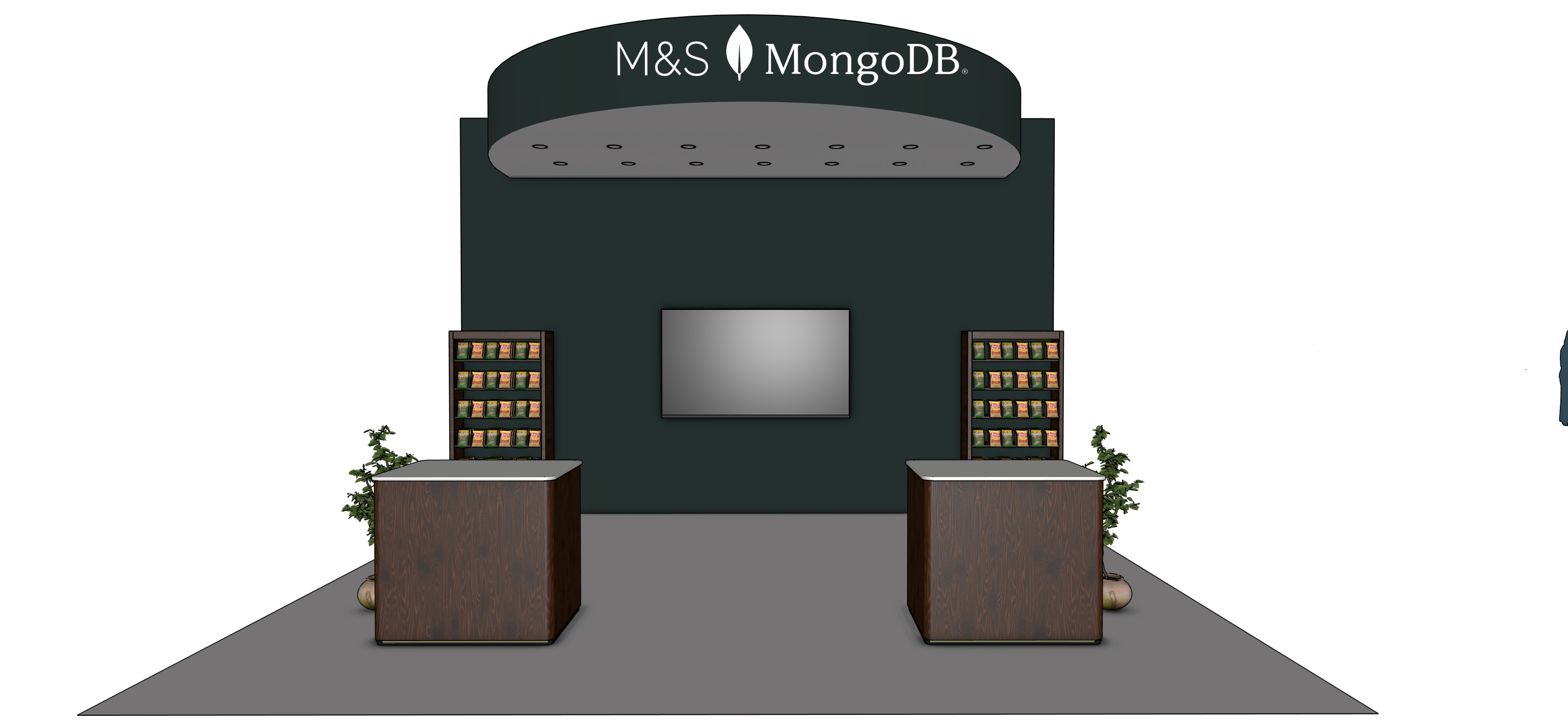 photorealistic render of a 6m wide exhibition trade show stand against a white background the stand is 4m tall with a large curved arch fascia at the top in dark forest green with m s mongodb branding and a green mongodb leaf logo in white text below the arch is a flat dark green back wall with a central flatscreen monitor mounted on it on either side of the monitor are tall dark wood retail shelving units filled with colourful food product packets two separate square dark walnut wood counter desks sit symmetrically in front of the stand one on the left and one on the right each with a white top surface small green plants placed beside each desk grey carpet floor tile warm downlighting from spotlights recessed into the underside of the arch fascia clean white studio background straight on front elevation perspective photorealistic exhibition stand render white led downlights mounted on the bottom lip of both wooden counter desks where they meet the floor