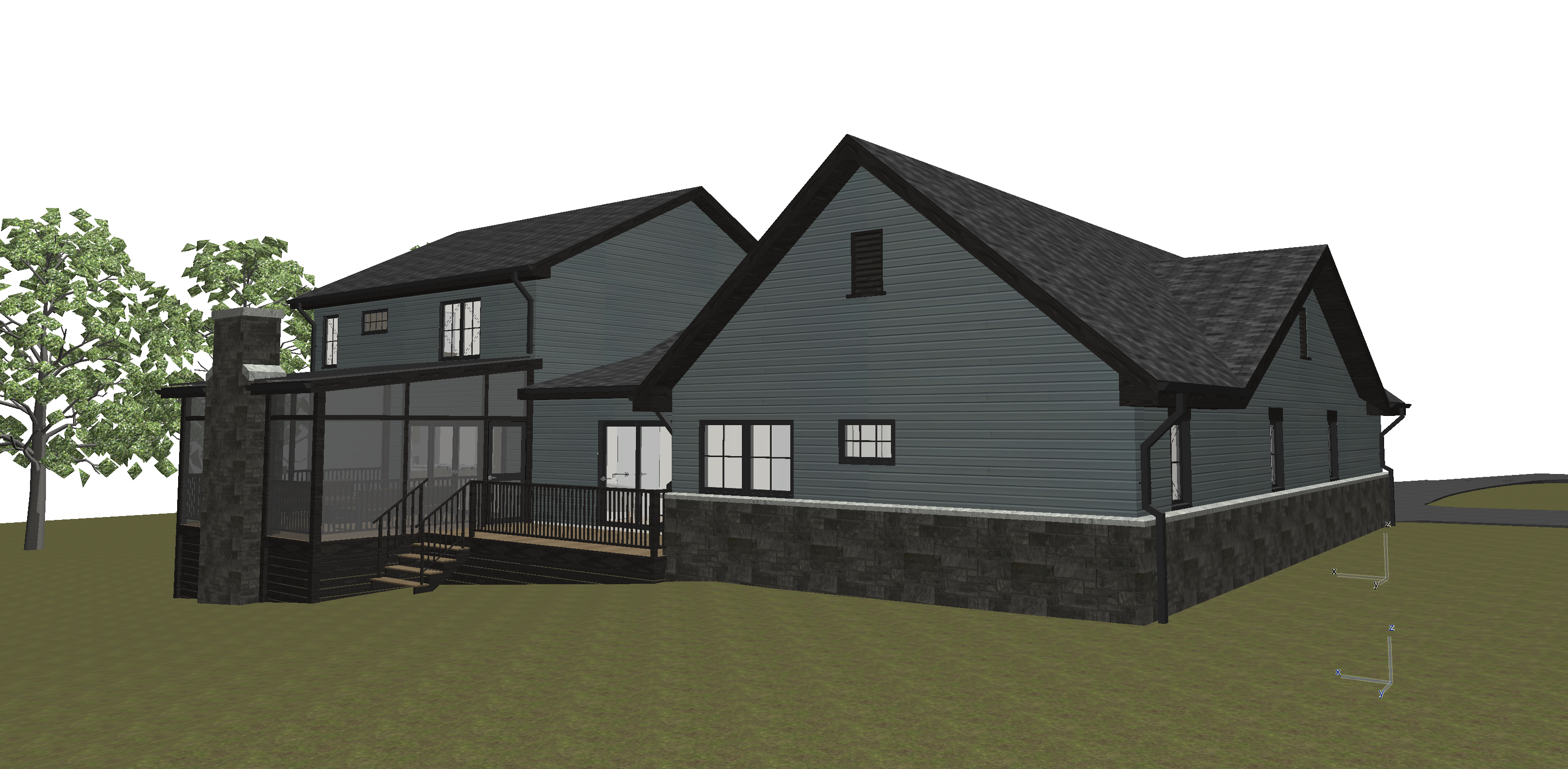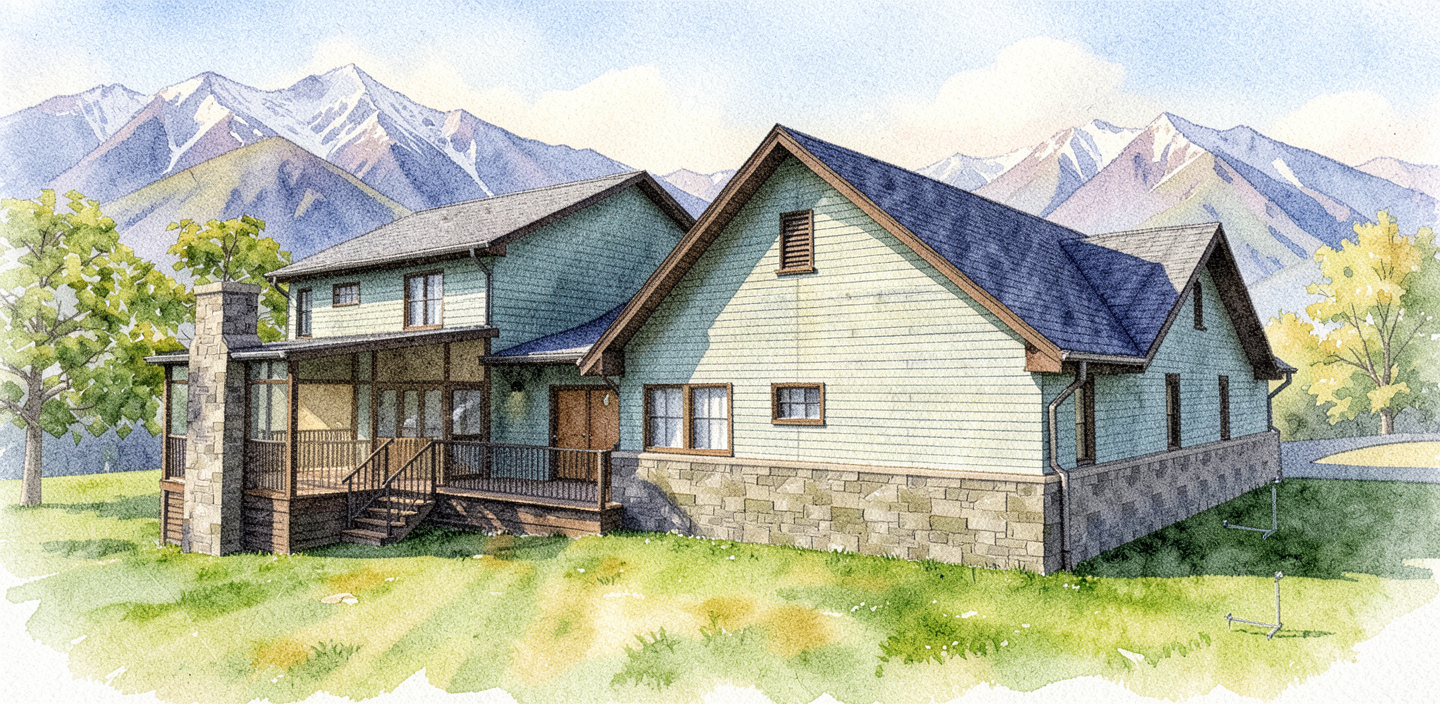grainy watercolor rendering of home with distant tree covered mountains in the background maintain exact colors from source image