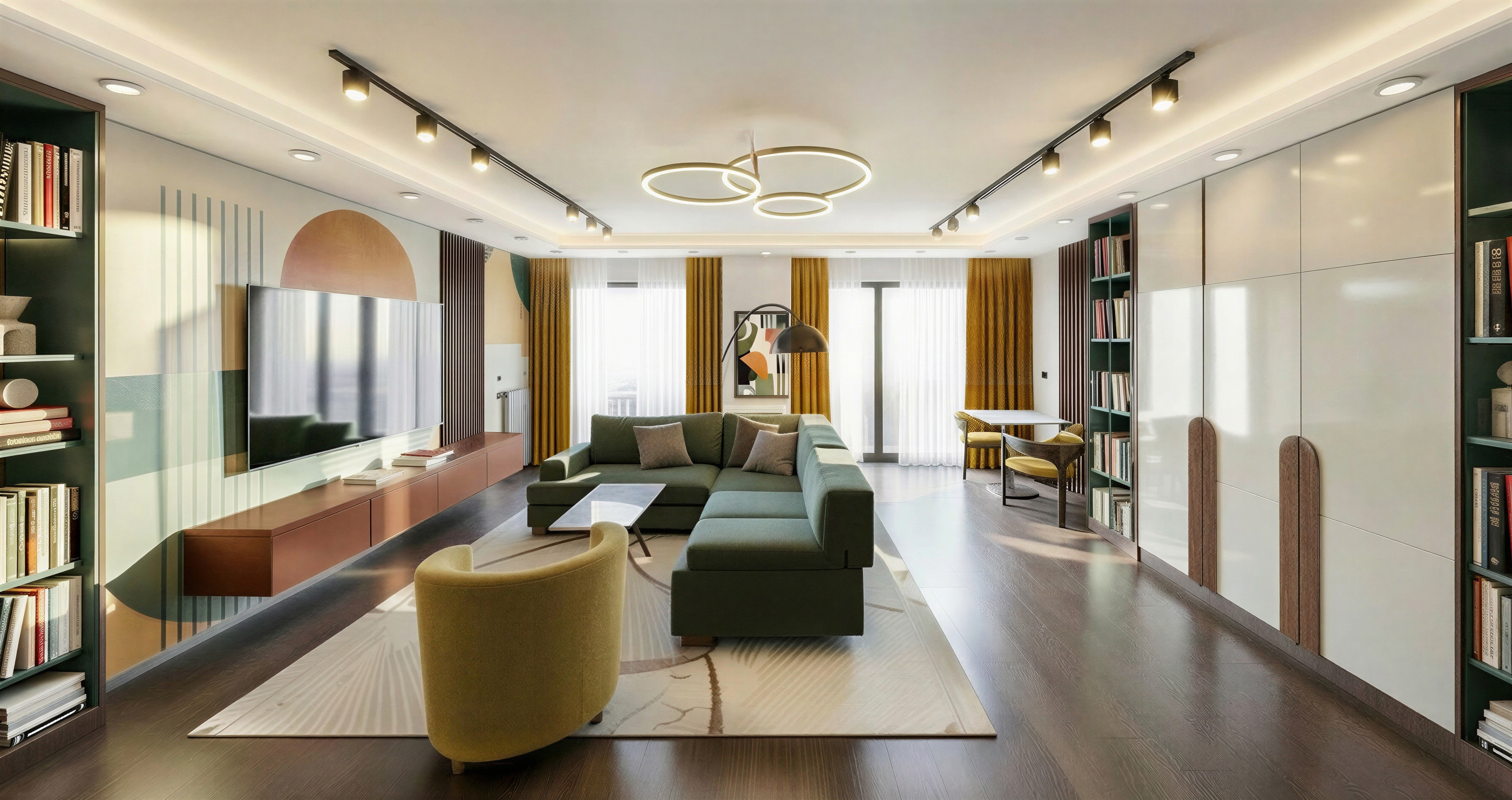 exterior shot add this armchair next to the sofa on the right side keep everything else exactly the same do not change the artwork keep millwork simple like the image