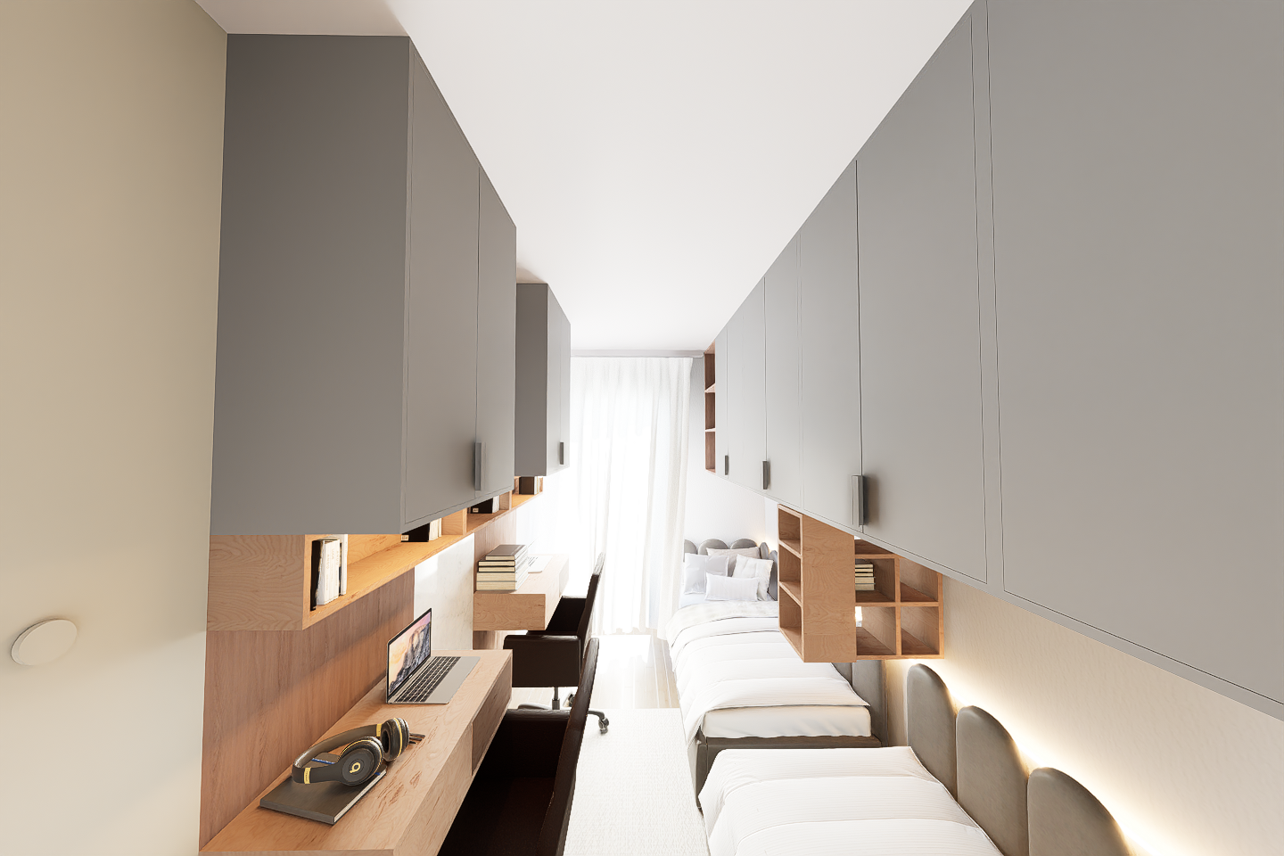 ultra realistic interior render enhancement preserve exact camera angle perspective proportions and layout do not modify geometry wall positions ceiling shape furniture dimensions or spacing between elements enhance materials and realism only cabinets smooth matte lacquer finish in soft warm grey tone clean edges minimal reflections ultra premium finish wood elements desk shelves warm walnut tone with rich natural grain subtle variation matte satin finish no gloss beds high end upholstered headboards with soft fabric texture slightly rounded edges realistic stitching premium hotel style look bedding crisp white cotton with subtle folds natural wrinkles layered pillows for realism styling keep minimal and controlled due to narrow space add a few curated decor items on shelves books small objects minimal accessories keep desk setup clean and premium laptop stays add subtle realism only do not clutter the space lighting soft natural daylight coming from window at the end diffused through sheer curtains add warm indirect led strip lighting under cabinets and behind headboards for depth balanced exposure no overblown highlights soft global illumination with realistic shadows rendering quality ultra photorealistic high resolution accurate material definition and shadow depth slight depth of field for realism important constraints do not change bed positions cabinet layout desk alignment or corridor width do not redesign anything only enhance materials lighting and realism