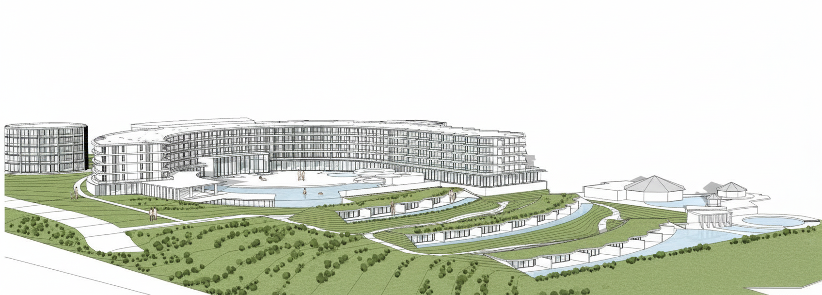 scene modern beachfront hotel on a terraced landscape keep all geometry exactly as in the original architectural drawing do not deform or change building shapes levels or pool locations right bottom side transitions from grass to sandy beach light beige sand visible sea beyond the beach lighting midday clear sky bright sun soft shadows sun is behind the camera not visible in frame no dark facade no backlight silhouette no dark pool areas architecture white exterior finish large glass windows with realistic reflections add soft beige mediterranean stone texture on selected large wall surfaces gentle subtle not covering everything add green hanging plants on every balcony clean straight lines no distortion landscape soft pastel green grass on terraces not dry mediterranean shrubs and low bushes palm trees only in the background not blocking buildings smooth transition from grass to beach sand on the right water light blue pools with calm water keep water strictly inside pool boundaries water must not touch buildings or windows accurate edges no overflow people add 10 15 people for scale naturally placed 2 3 people on loungers on the beach or grass terrace a few people swimming in the pools a few people standing or sitting on hotel balconies relaxed resort atmosphere people should be small and realistic not the main focus style high realism pastel tones clean composition no fantasy elements