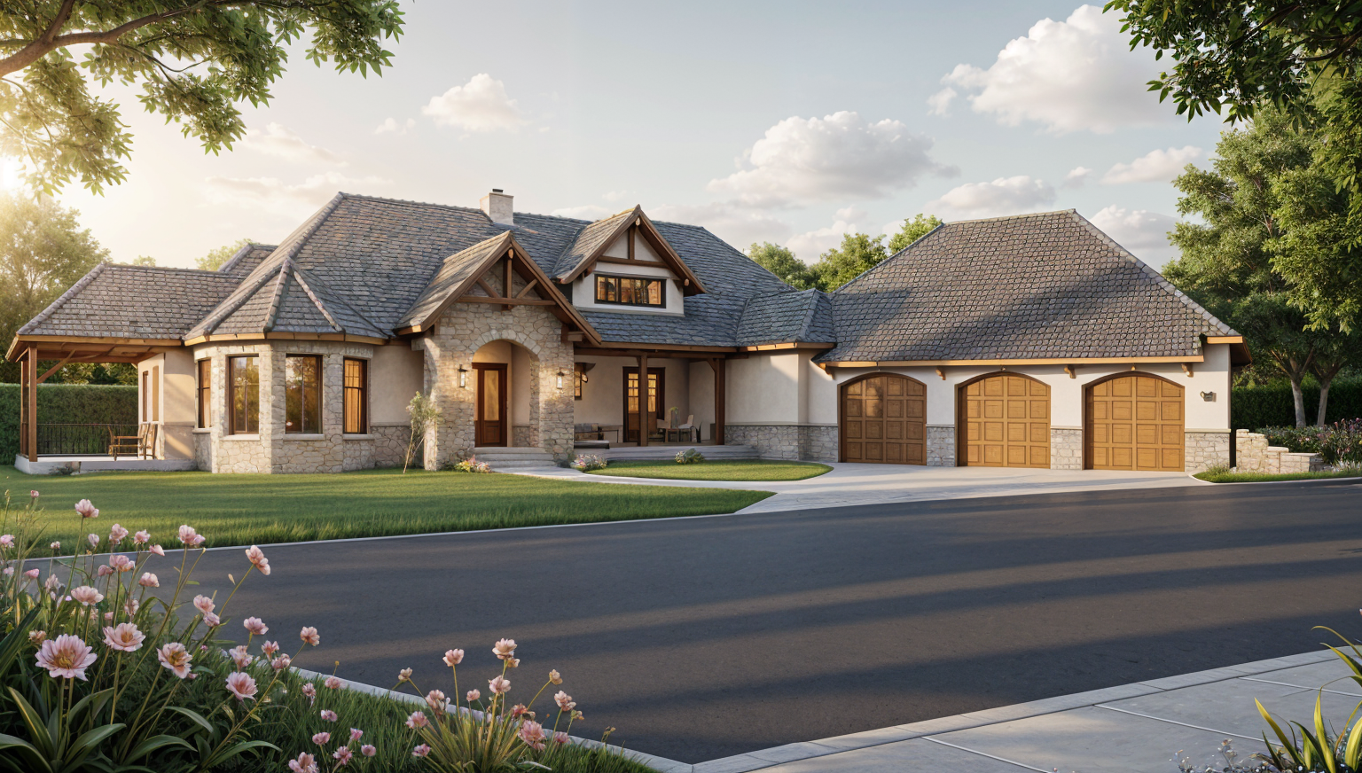 modern minimalist house on a hill elegant architectural design the building features a dark grey textured roof with a sleek contemporary style the exterior walls are a crisp white providing a fresh clean appearance the wooden panels and staircase are a warm natural wood tone adding depth and contrast the glass windows are large and reflective creating a sense of openness the lush green grass on the hill enhances the natural setting the sky is a clear vibrant blue suggesting a serene peaceful atmosphere the overall scene exudes tranquility and modern elegance