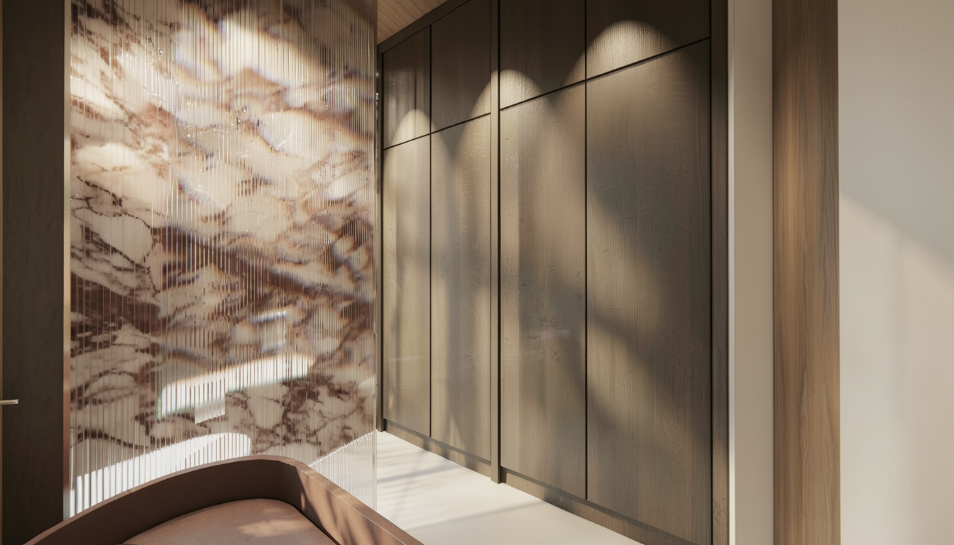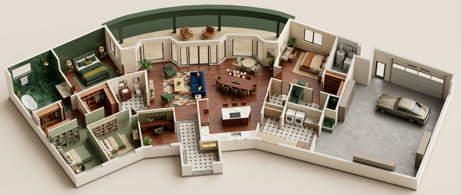 render a modern kitchen with a clean minimalist design use soft beige for the cabinets and a light cream for the walls to create an inviting atmosphere the countertop and sink area should be a sleek charcoal gray the dining table is glass with muted gray chairs the refrigerator and oven should be in a classic white adding a touch of brightness above a circular ceiling light fixture casts a gentle glow overall the color palette is neutral and calming with a harmonious balance between light and dark elements