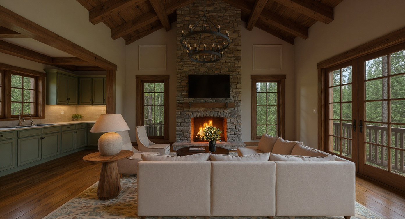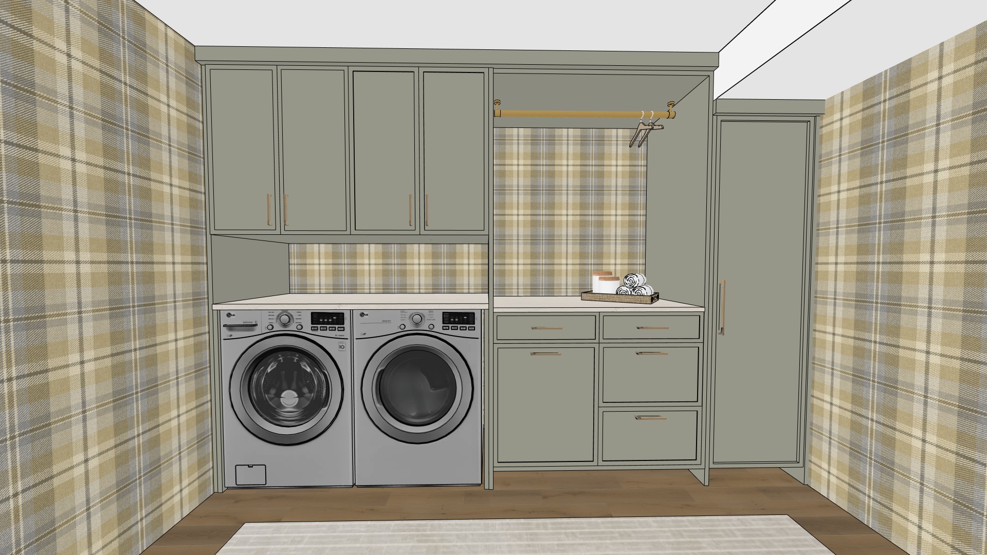 ultra realistic interior utility room laundry room rendering shown from a straight on frontal perspective centered on the main laundry wall with integrated appliances and cabinetry creating a symmetrical and highly organized composition the room features custom shaker style cabinetry painted in a muted sage green tone with a soft desaturated finish and subtle gray undertones consistent with the harris project palette all cabinetry has clean recessed panels and is fitted with slim brushed brass bar pulls evenly aligned across doors and drawers centered on the main wall a front loading washer and dryer are installed side by side beneath the countertop fully integrated into the cabinetry layout above the appliances upper shaker cabinets run horizontally providing enclosed storage to the right of the washer and dryer a counter height folding surface is finished with a light off white solid surface countertop smooth and matte in appearance below the counter base cabinets and drawers provide additional storage above this counter a brass hanging rod is mounted holding wooden hangers reinforcing the garment care function of the room a decorative tray with neatly folded white towels is placed on the countertop on the far right a tall full height storage cabinet in the same muted sage green finish provides vertical storage and visually balances the composition the entire back wall and side walls are fully covered in a plaid pattern wallpaper featuring a classic check design in layered tones of soft beige muted green warm gray and light tan creating texture and visual warmth while remaining cohesive with the cabinetry color the floor is finished in medium tone natural wood planks laid lengthwise with visible grain a light neutral area rug with subtle linear texture is placed centrally in front of the cabinetry softening the space the ceiling is finished in white and fitted with recessed spot lights evenly spaced to provide clean functional illumination throughout the room with no decorative ceiling fixtures lighting is soft even and neutral consistent with architectural visualization standards the overall aesthetic reflects a sketchup style architectural 3d render characterized by clean outlines simplified geometry crisp edges and flat yet realistic materials maintaining accurate proportions and a refined uncluttered composition no elements are added or altered the scene remains fully faithful to the original image