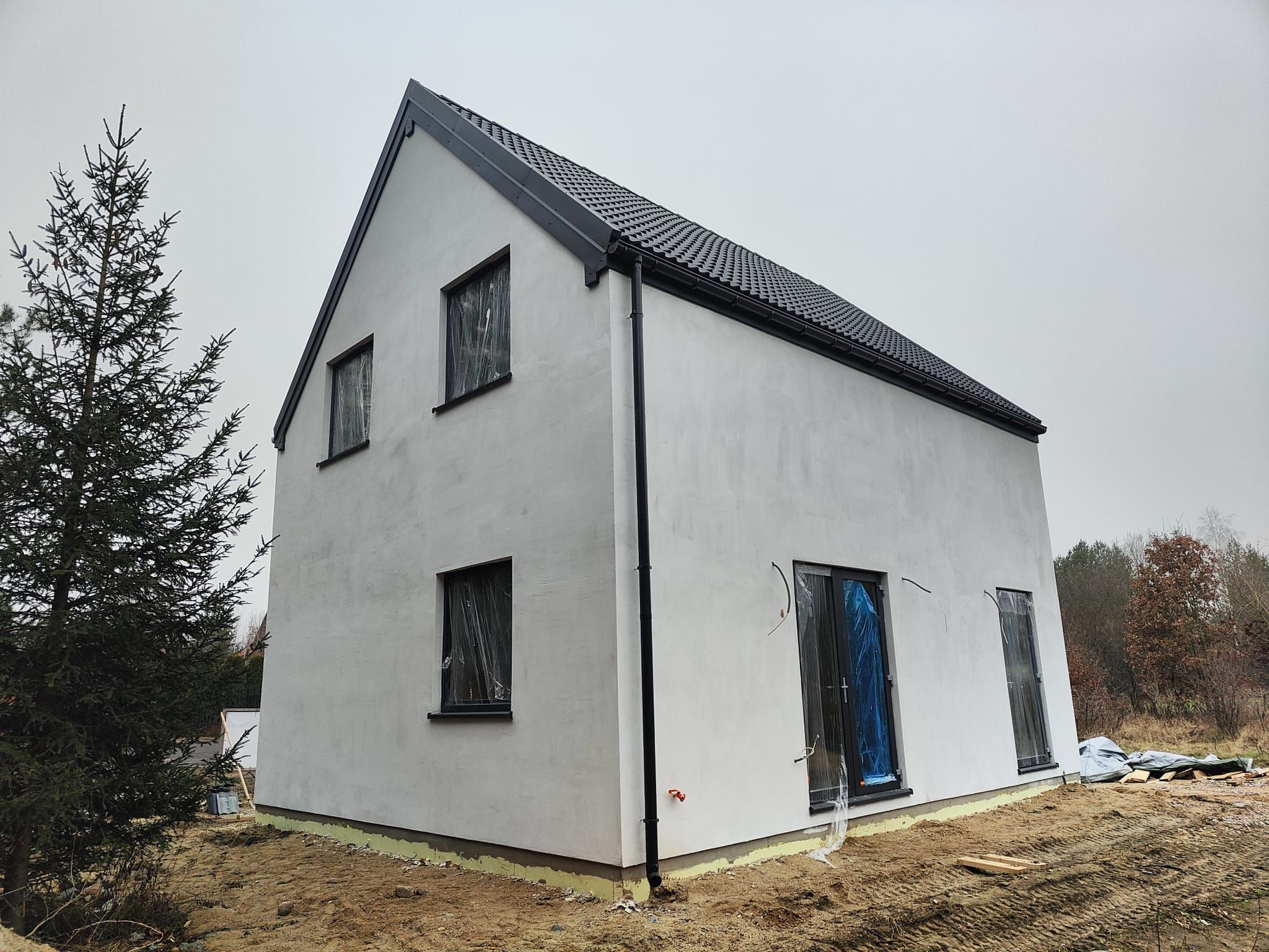 modernist exterior shot finish the elevations in white plaster and add wooden elevation finishes in a few places do not change the shape of the roof and do not add eaves make a nice access green grass a wooden terrace with a pergola place trees and garden furniture around the house architecture
