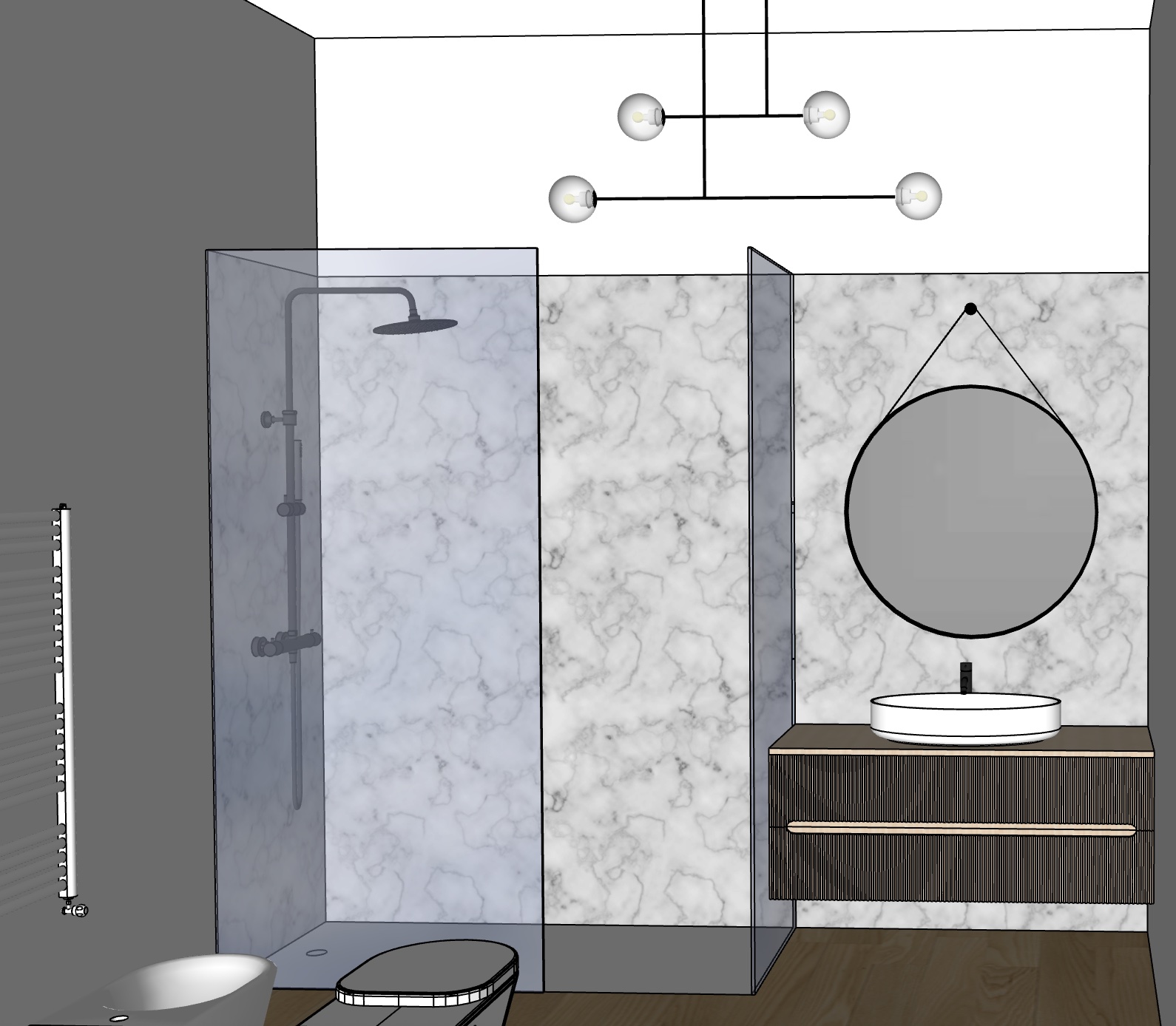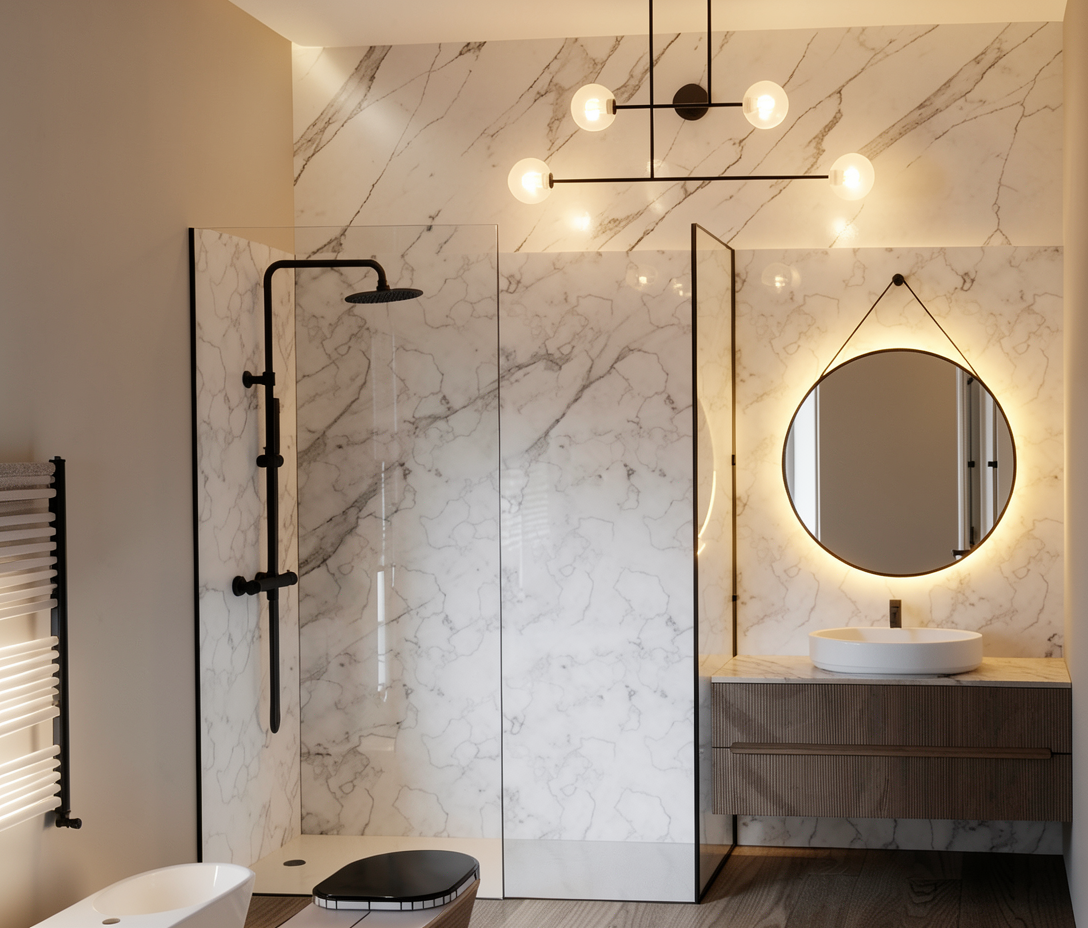 white marble wall make the round mirror backlit warm lights scandinavian vibe