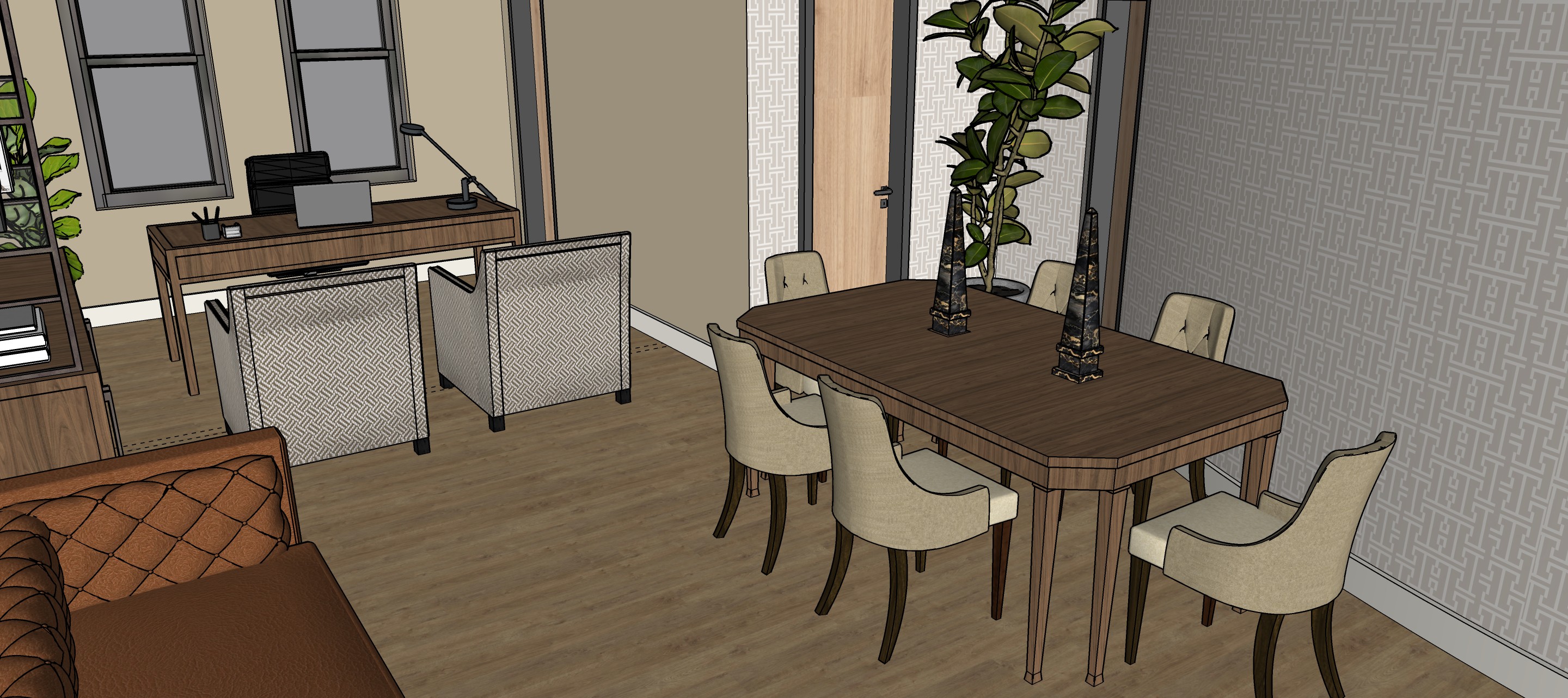 render this office with average lighting adding luxury silk curtains accenting the windows and classic ethnic art work on the walls the computer screen needs to be turned around 180
