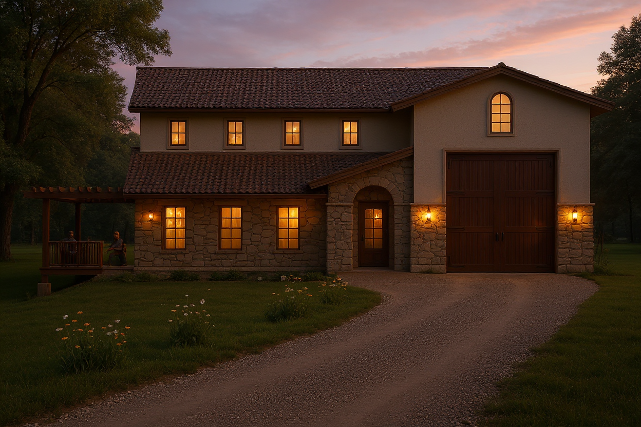 gravel drive to garage door farm setting with wildflowers in the yard add more light to pergola porch on left side of house zoom out slightly sunset add lights either side of garage door on rock