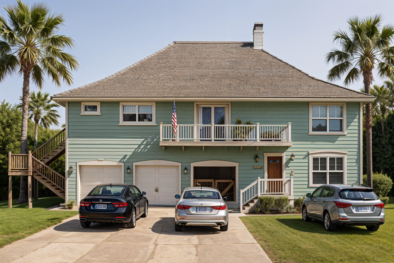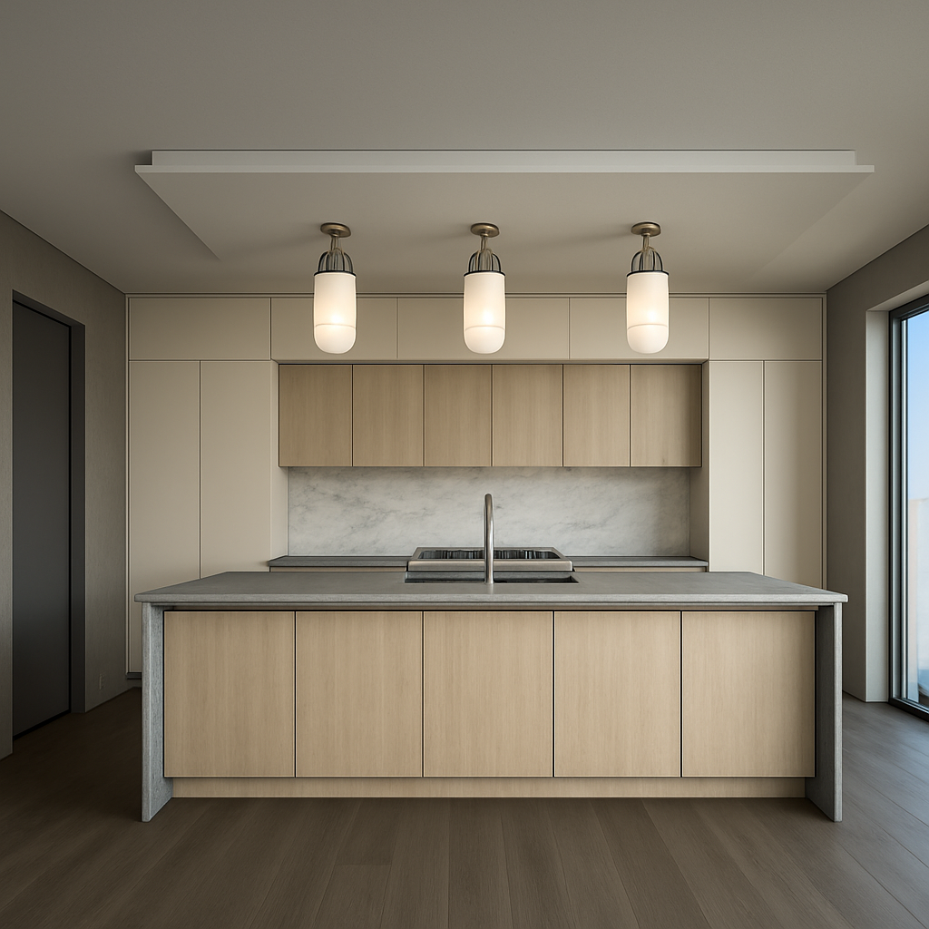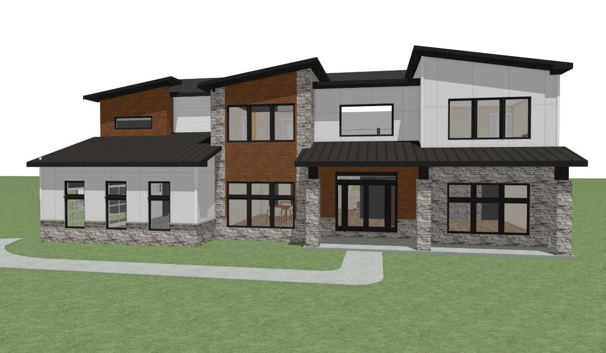 render this 3d image to appear photo realistic maintain all existing architectural materials and structural elements exactly as shown enhance the setting with a lush well maintained landscape include minimal beds manicured shrubs and a tree lined backdrop that frames the home naturally the windows should have a glossy finish with clear reflections of the surrounding trees and sky lighting should feel natural with soft shadows and realistic depth to bring the scene to life