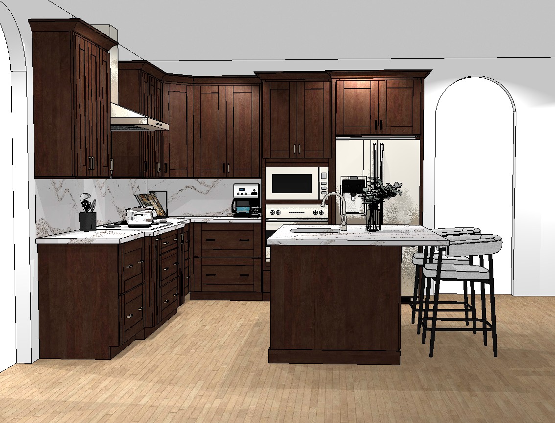 do not add artificial lighting right and left arch through is a hallway do not saturate room with color make the cabinets true to the color in the sketch remove arch in camera view and put a cook book in the corner where it is currently showing a wood block add coffee into the coffee pot remove natural sunlight from room and make hardware gold