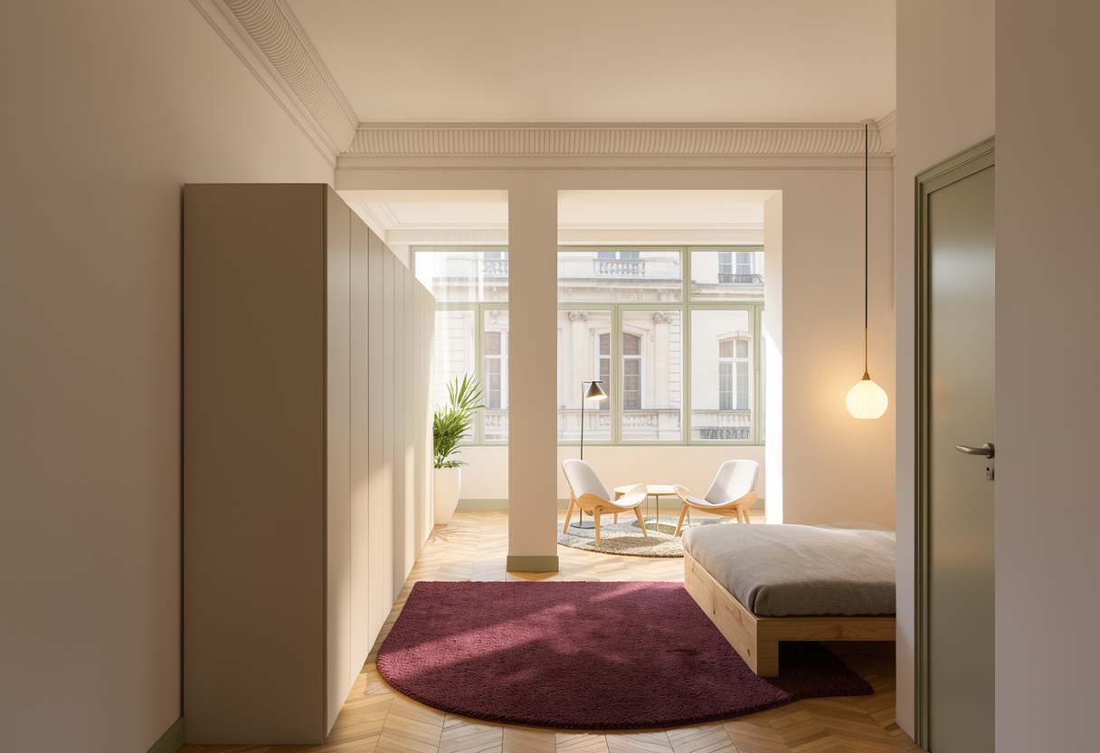 maintain all the materials and colours and tones the feature wall laminate is in soft line texture laminate cove light in the recessed ceiling illuminating the the top of ceiling