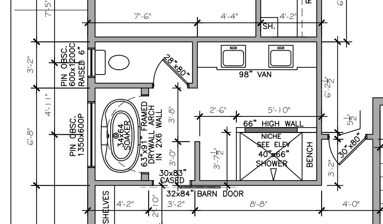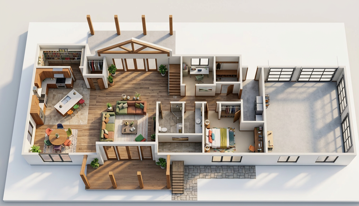 convert this floor plan into a realistic isometric 3d view of a full house show the space from an elevated angle with furniture walls and details visible make the flooring and shower walls a dark grey 24 x 48 tile with speckles make the vanity dark brown use the same furniture as shows on the plan do not change the orientation of the floorplan