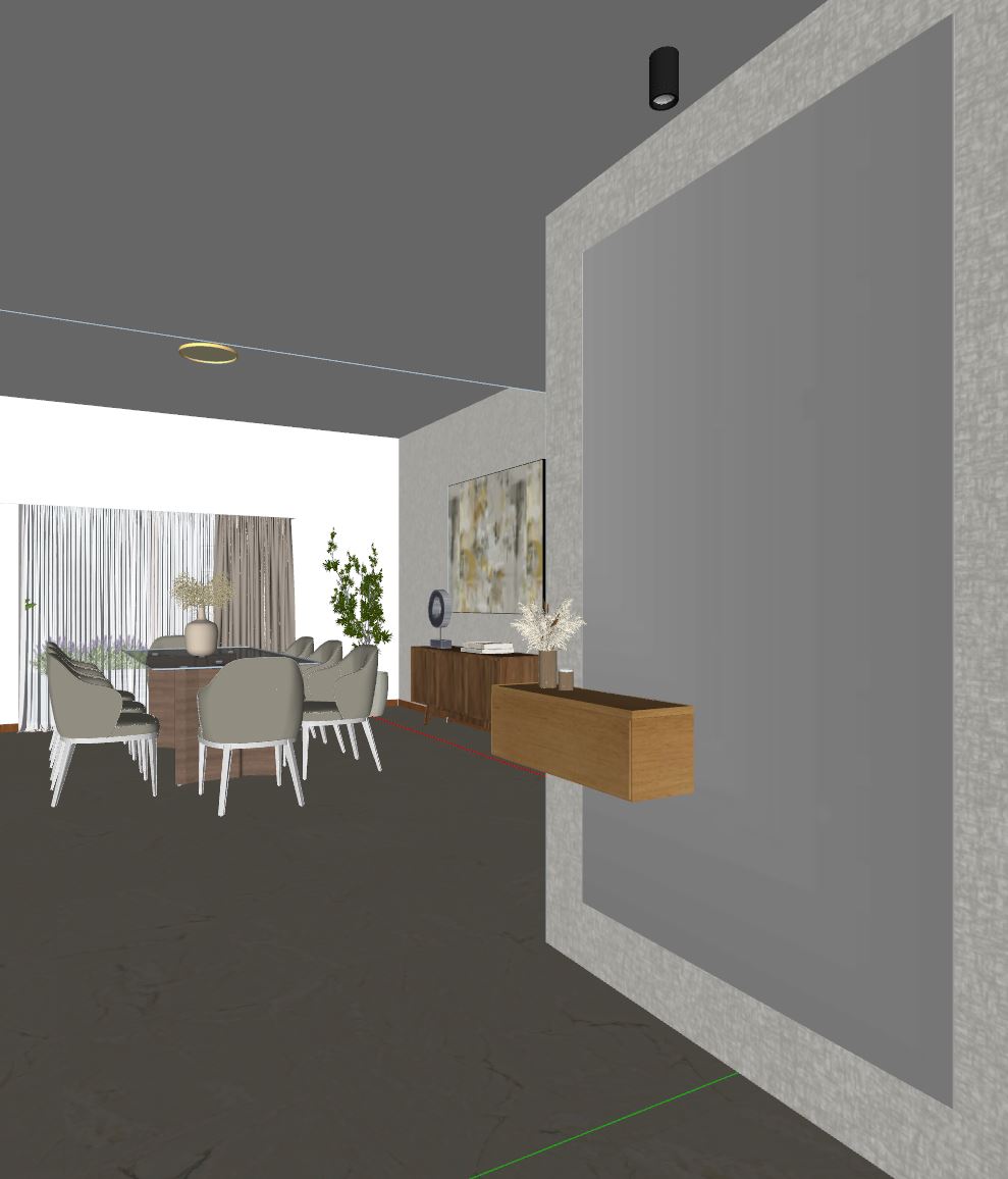 estoy trabajando con un screenshot del modelo 3d ayudame a generar una imagen ultrarealista es la entrada a una casa habitacion del lado derecho tenemos un espejo grande de casi piso a techo sin marco con un spot de techo para iluminarlo el muro en el que se encuentra el espejo tiene un papel tapiz de acabado al fondo tenemos el comedor muros y techos en color blanco piso en formato 60x60 tipo cemento claro respeta el dise o del mobiliario y la proporcion de la imagen