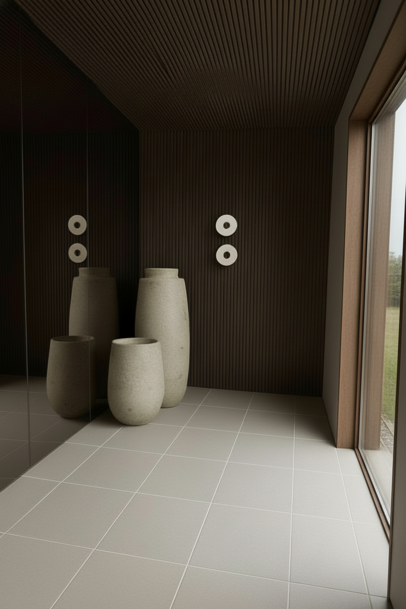 make the cabinets ceiling and walls shoji white colored add crown molding change the floor to extra wide plank european lighter white oak flooring remove the circles and dots
