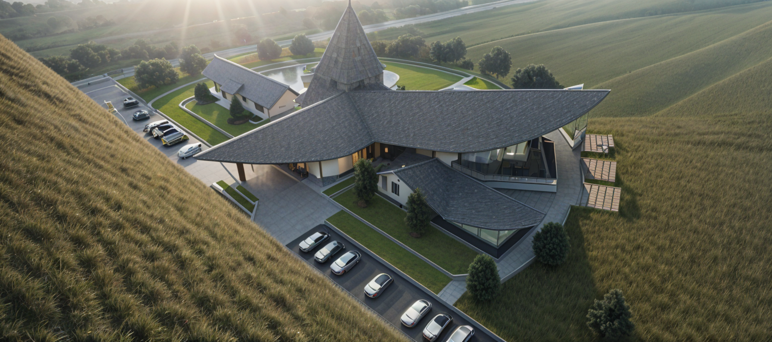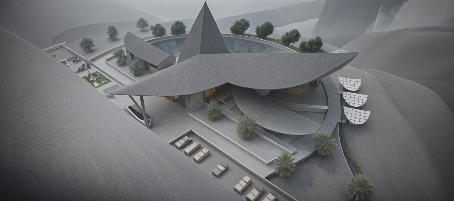 wide angle shot 1 your specialist of making a 3d render realistic 2 thing not to do don t do noting with physical of building don t do noting with roof building 3 things i would like you to do tree around building lake around area like reference roof wood color realistic natural scene building in lake architecture