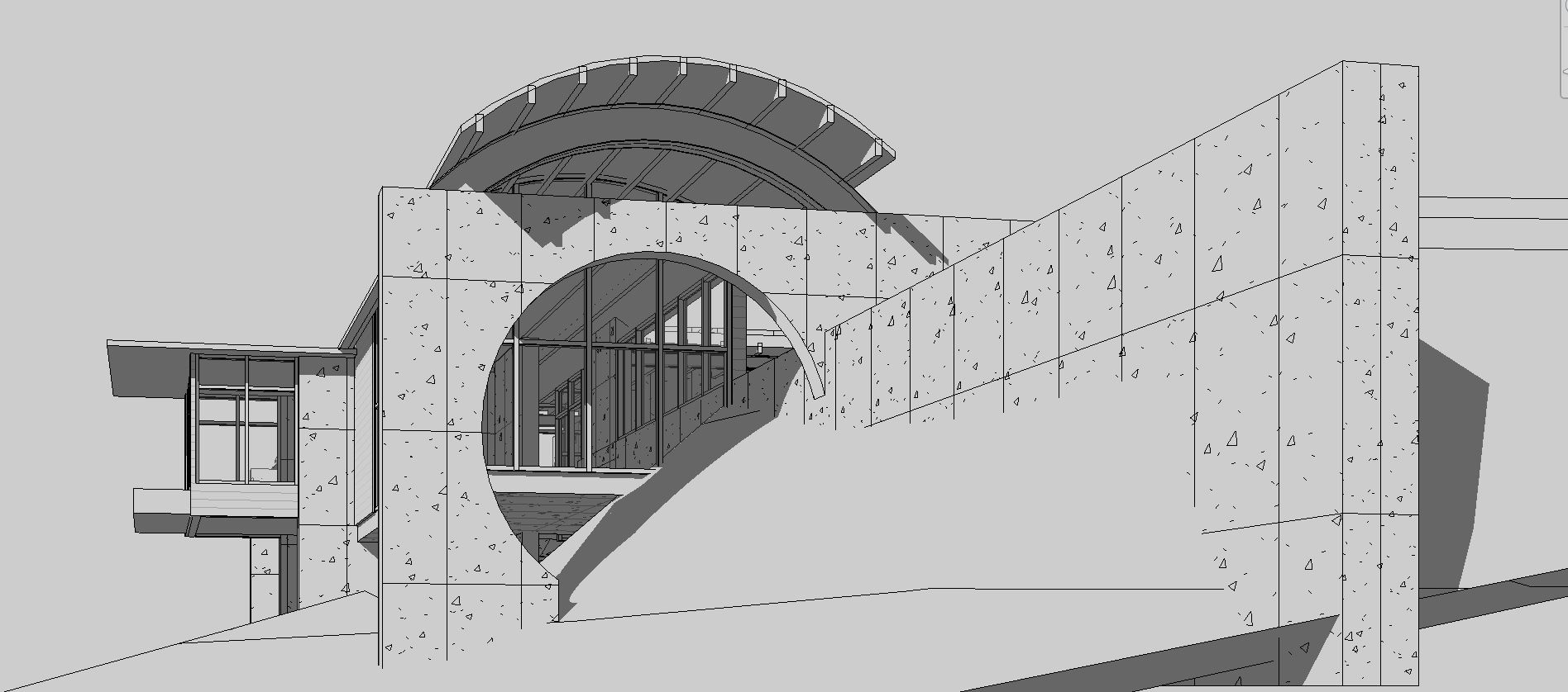 industrial design corten steel and concrete panels large grid windows tall grass foreground fog sunlight on building face