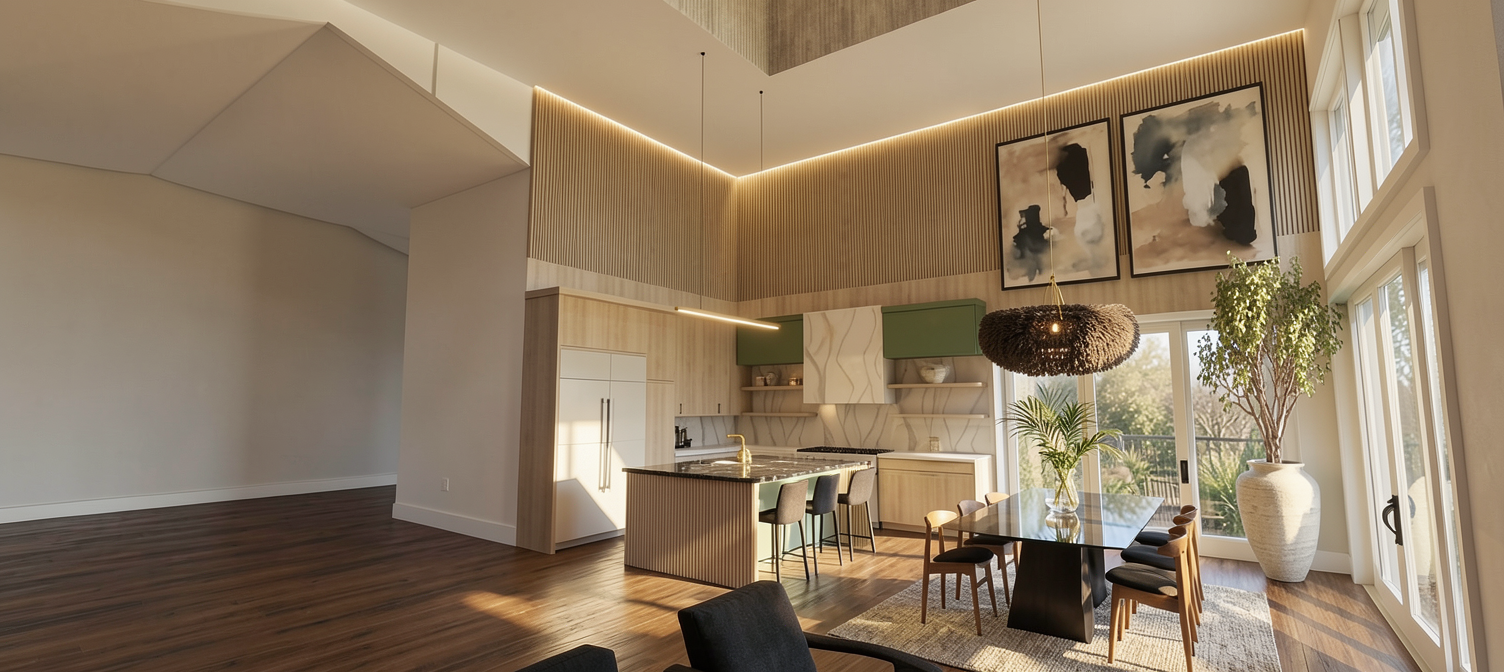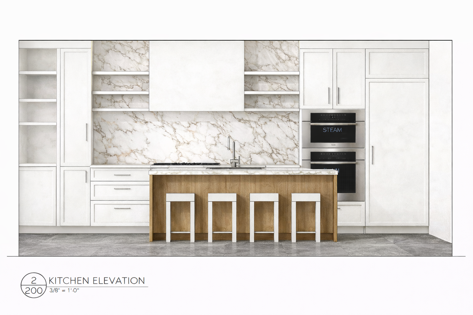photo realistic rendering can we slightly skew angle got see counter coming down the sides of the island waterfall style do not change anything in the shape of cabinets not an actual waterfall referencing counter style slight perspective so we can see side of island counter