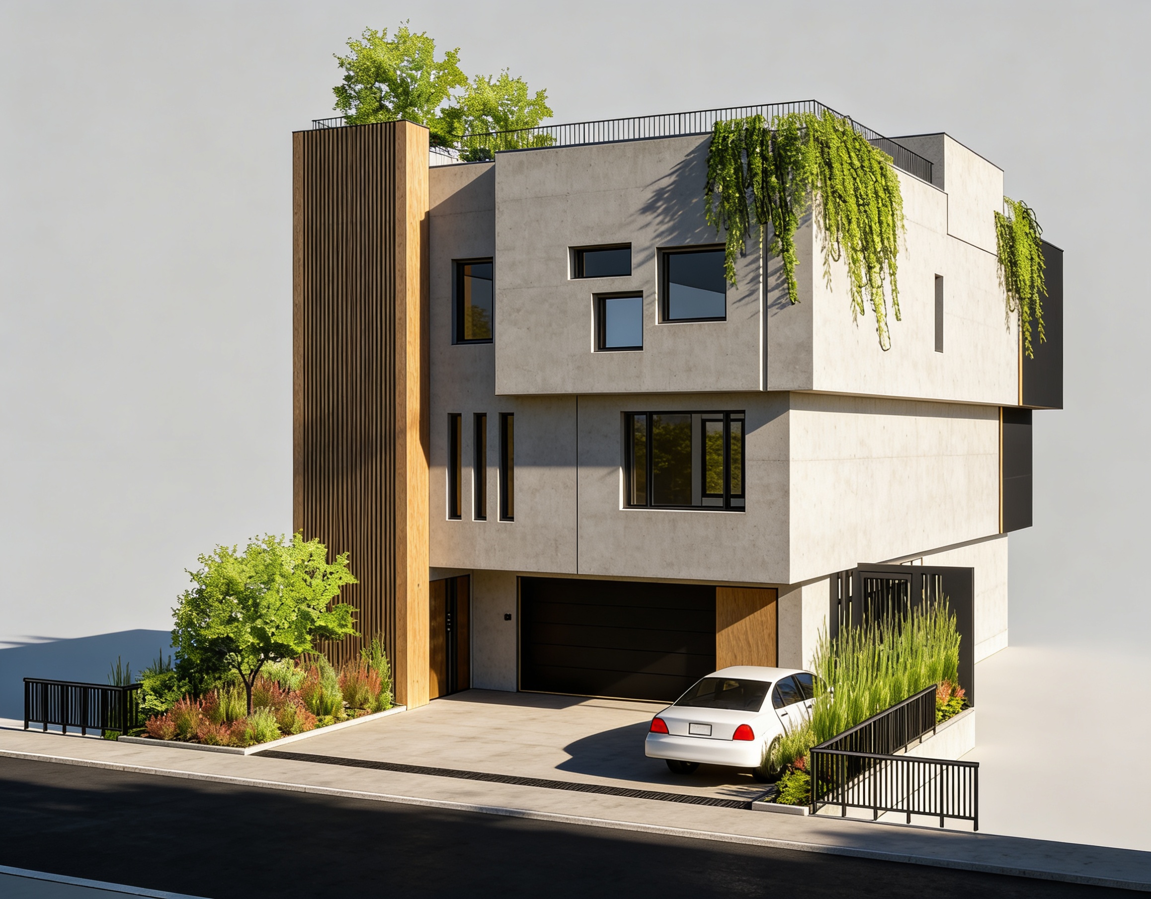 mid day sunlight mid tone gray polished concrete wall finish lush greenery on roofdeck and ground floor